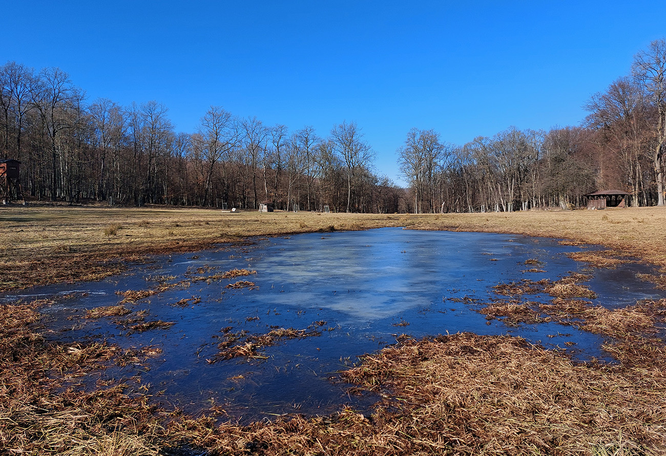 V podstate modrá turistická značka z Tlmáč cez Uhliská až na Havránkovu lúku, potom zostup do Žarnovice po červenej. Jednoduché, prehľadné, výborne značené – najmä to je dosť dôležitý fakt, pretože chodník tu na mnohých miestach neexistuje a keby neboli značky na „každom druhom“ strome, bola by to niekde aj taká menšia motanica. Najmä takto na prelome neskutočne suchého januára a februára, absolútne bez snehu, zato s našuchorenou vrstvou lístia, ktorá úspešne maskovala nielen chodník (ak tam niekde vôbec je), ale aj obvyklý lesný bordel v podobe kameňov a konárov. S parametrami 42 km / 1900 v.m. by to bolo aj dobré na „zrýchlený presun“, lebo je tam veľa zaujímavých a pekných miest, medzi ktorými sú dlhé a monotónne úseky hospodárskymi lesmi. Lenže kvôli spomenutým dôvodom som bol niekedy rád aj za rýchlejšiu chôdzu. Aj tak mi dobre členky povykrúcalo. V lete by som tam nešiel ani za nič, zato jar a jeseň sú na prechádzku v tomto kraji ideálne. Teraz? Prvá februárová noc bola jasná, takže zvážnicové blatá parádne schrumkaveli a v tieňoch sa také držali celý deň, to bolo super. Deň tiež jasný, s teplotami na dlhé tričko, takže počasie ideál. Aj smer je lepší takýto, z juhu na sever, to nízke slnko som mal pri neskoršom štarte väčšinou do chrbta. Takto to celé vyzeralo: