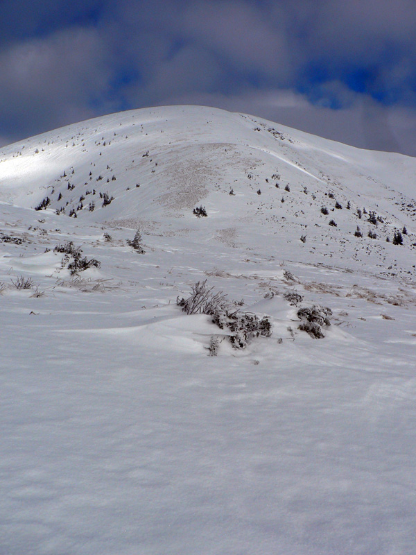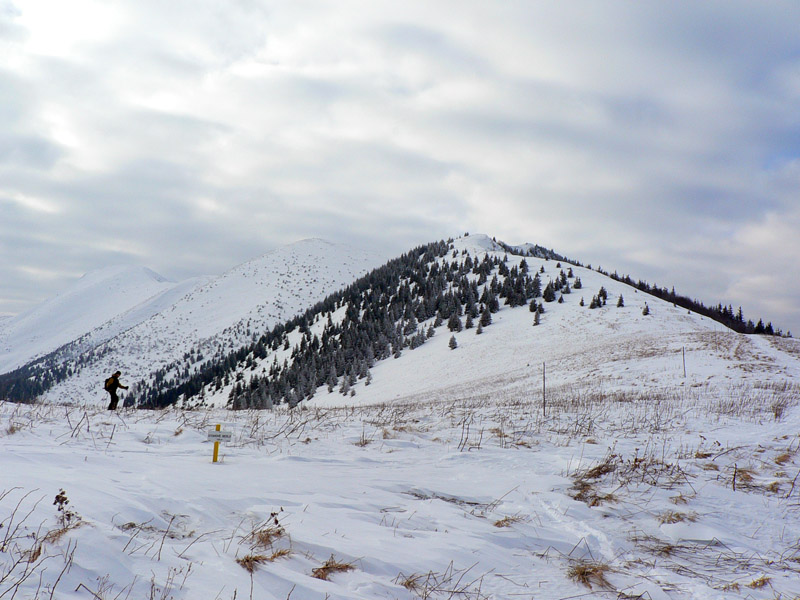 V poslednom lese pod Stohom definitívne strácam značku, chvíľu sa motám a potom naverímboha bojujem hore lesom. Smer je jasný, chodník netreba, že? Keby som mapu doma nenechal, ušetrím pár minút, no čo už... Zato sa čoraz dôraznejšie ozýva megaodrenina na holeni, ktorú som doma nezalepil, veď už vyzerala zahojená. Ďaľší prešľap... Aj preto pri stúpaní po lysine Stohu idú lyže zas na batoh, tu je to už úplne do trávy vylízané a nohu takto menej cítim. Hore som o dobrú hodinu neskôr, ako som rátal. Nič to, po Kriváň pridám a uvidím čo tam.