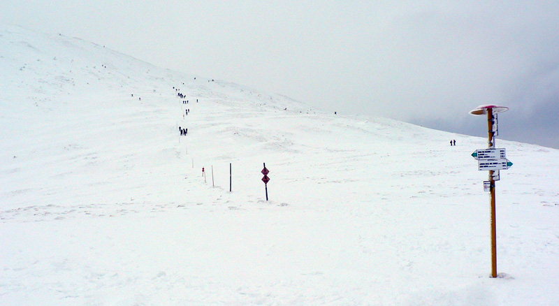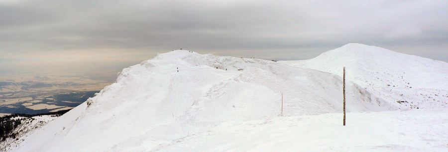 Zo sedla Stohového do sedla Snilovského ľudí ako mravcov, hlavne od Poludňového grúňa poriadne zástupy. Hrebeň vyfúkaný, našťastie nie do hladkého ľadu, šmirgeľ pod pásmi drží aj v strmých svahoch, niekde je na zemi dokonca trochu prášku. Len cítim že sem akosi nepatrím, väčšinou míňam pešiakov a snežničiarov. Pocit vrcholí, keď stretnem tetu v rifliach a s kabelkou :-)