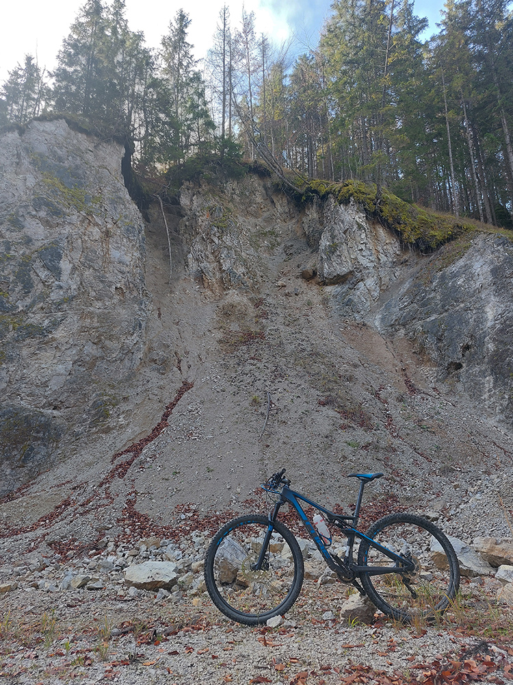 Hore dolinou potom čierny asfalt a ťažké nohy, a to som nevedel, že to druhé tak ostane až do konca. Ďalšia strada bianca doprava, ale predtým prieskum slepej odbočky doľava. Lebo mapy.com ju ukazujú ako spevnenú, v realite je však trochu rozbitá a prevažne kamenisto-hlinitá. A miestami aj zabordelovaná konármi po ťažbe. Takto na jeseň sa niektoré zákerne skrývajú pod napadaným lístím. Sklon ale v pohode, až ku koncu trochu väčší a cesta končí pri pekných bralkách: