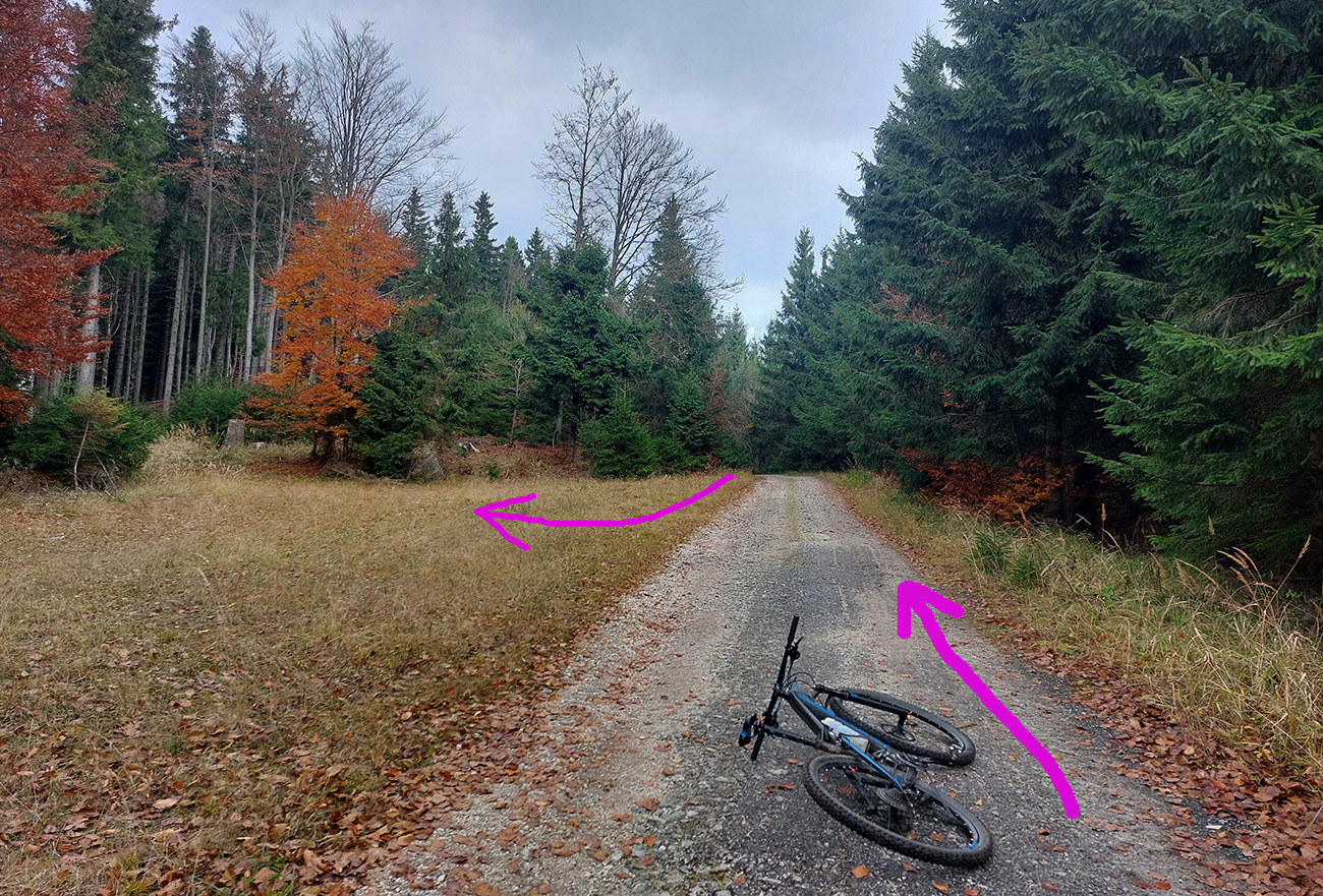 Takže prvá mašľa či uzol: doľava, priamo popod Flochovú, také kolečko okolo horárne Jegorovka a susedného, bezmenného kopca (kóta 1264 m). Do sedielka na koniec stúpania pohodová šotolinka, potom asi štyri možnosti, treba brať druhú sprava (krmelec po ľavej ruke). Cesta klesá, mení sa z „bianca“ na „verde“ a vyzerá, že sa ide stratiť, aj keď mapy.com ju majú ako spevnenú. Ale je zjazdná a po chvíli sa rozšíri na serióznu zvážnicovú normu. Za odbočkou k Jegorovke sa napojí na ešte fajnovejšiu, šotolinovú. Potom už len nazad na Široký peň. Kolečko v takomto smere je jednoznačne pohodlnejšie ako opačne, keby čosi...