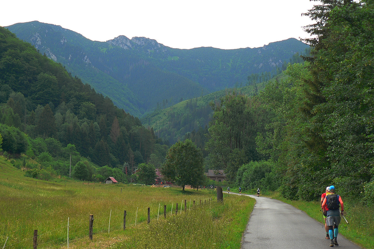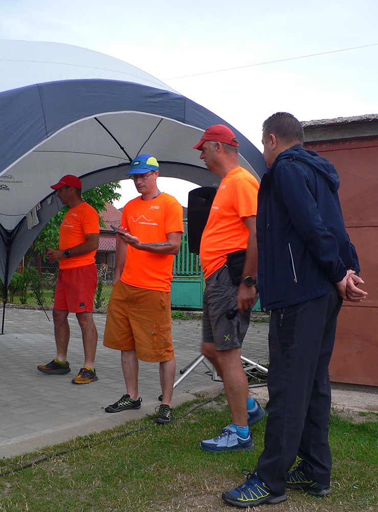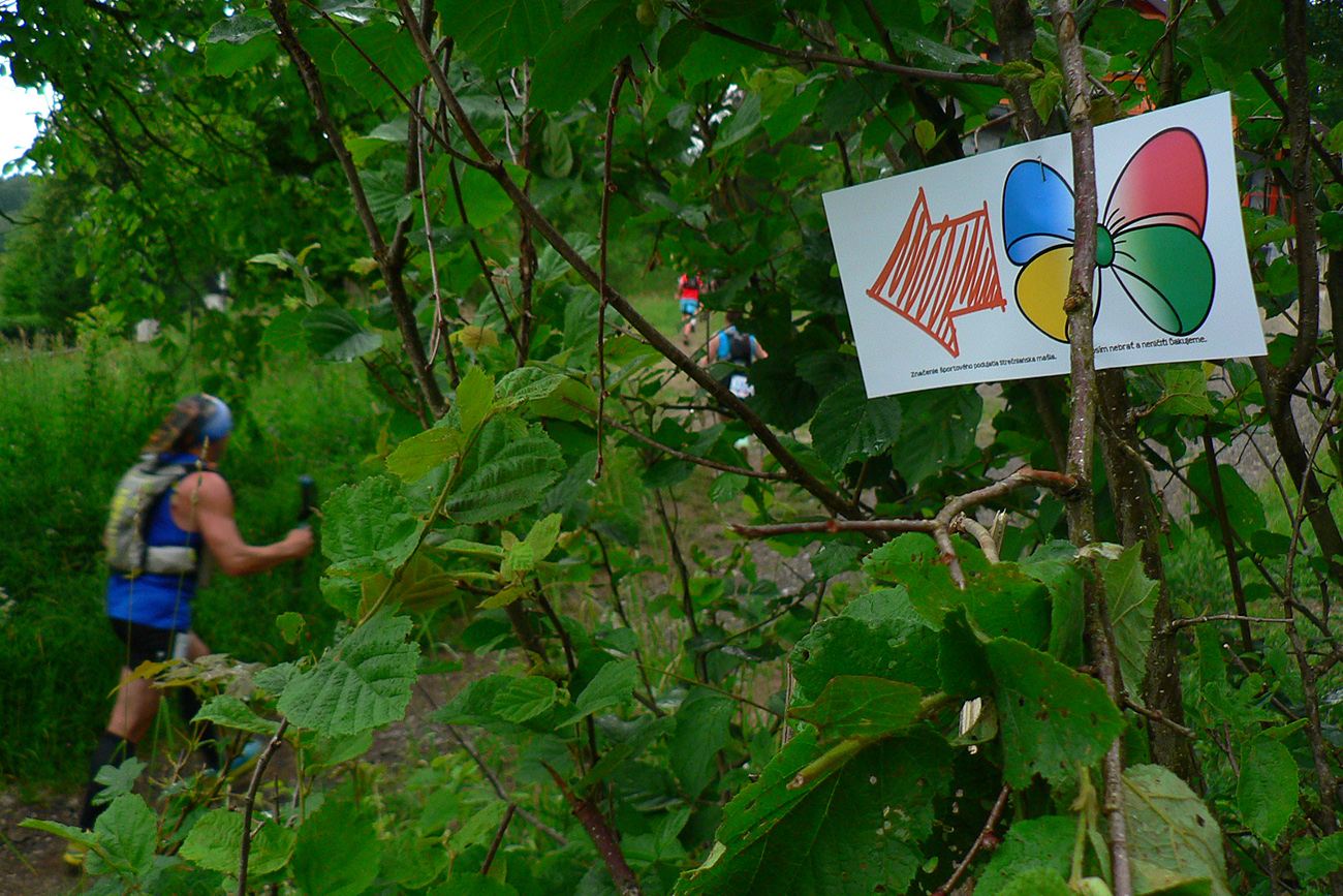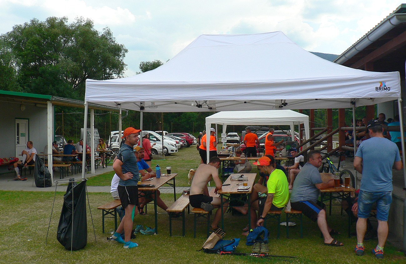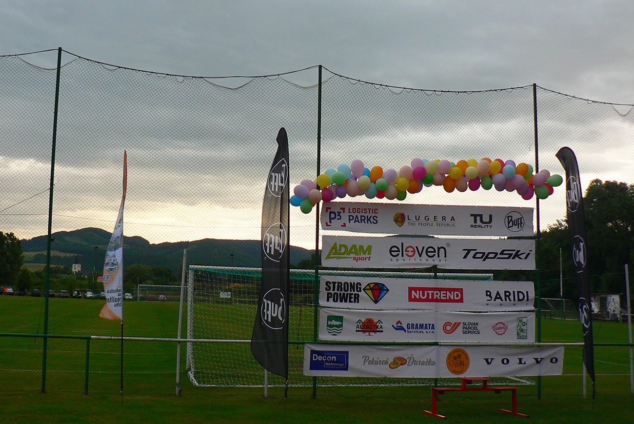 Registrácia fičala v piatok večer aj v sobotu ráno - zdalo sa, že ako hodinky, organizátori skúsení! Prespať sa dalo okolo futbalového ihriska, aj po miestnych ubytovniach, aj vo vlastných stanoch. Parádne zázemie je tá miestna Marakana pre celú akciu a trávička hebučká, ani karimatky hádam nebolo treba. K tomu bufet a teplá voda v sprchách furt, pre nenáročných hneď vedľa tečie Váh. Večerný príchod bol nutný, lebo štart dlhej trate o šiestej ráno. Na polovičnú (druhé kolečko cez Minčol) vyrážalo potom druhé stádo neskôr, o pol deviatej. Skorý štart bol fajn, lebo cieľové limity boli veľmi benevolentné pre obe trate, ale najmä mal byť príšerný hic. Veď aj bol, našťastie trochu pod mrakom a ráno z tej sivej deky aj symbolicky pokropilo a príjemne prevoňalo tie púdrové chodníky. Lebo sucho je teda fest a už dlho.