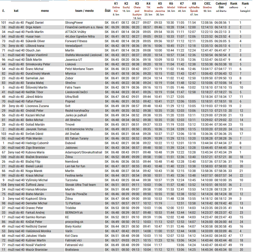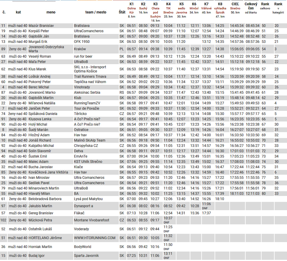 Kto sa teda doplazil pod cieľovú bránu, toho čakala tá hebká tráva na spamätanie sa v polohe ležmo a potom už mňamky nevídané a pochutiny všakovaké. Pre každého dokonca niečo v tombole a pre najrýchlejších okrem slávy na bedni a vecných cien aj finančné odmeny, pre ultrabehy vec nevídaná. Výsledky (aj po kategóriách) sú na HIKINGU ULTRA a (odtiaľ ukradnuté) aj dole v galérke. Najrýchlejší bol „sparťan“ Daniel Pagáč pred Adamom Drgom a na tretie miesto sa záverečným útokom pod Špicákom dostal Martin Pavlík. Ivana Líšková doletela šiesta celkovo a aj napriek tomu, že sa jej „od prvého kiláku“ nešlo dobre, nadelila druhej Zuzane Lisonovej 45 minút. Tretia dobehla v pohode sebe vlastnej Majka Kubová. Výsledky boli ale vyhlasované po kategóriách, nie celkovo, tak na fotkách je to trochu inak.