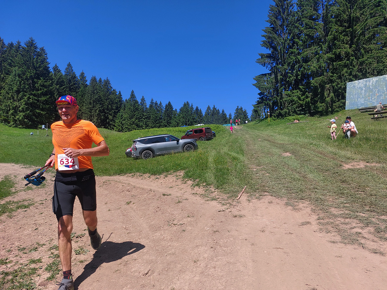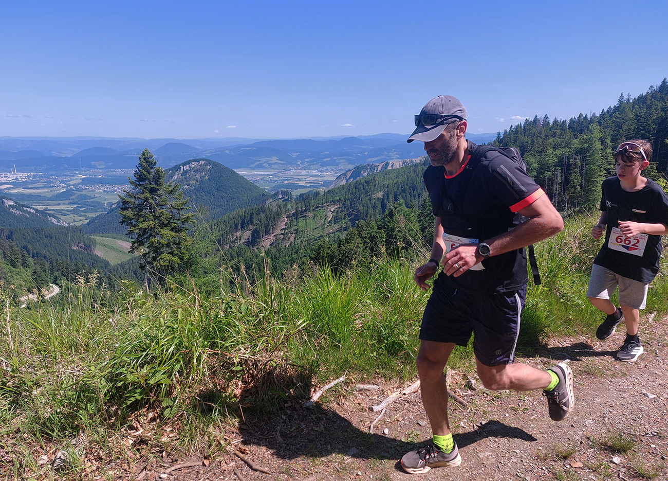 Za treťou občerstvovačkou (nad Višňovým) našli orgovia kadejaké lúčne chodníčky ponad aj pomedzi nové domy, aj s peknými výhľadmi do Žilinskej kotliny. Lenže na lúkach už dobre pripekalo. Okolo pomalších krátkotratiarov prefrčal budúci víťaz dlhej – Tomáš Kubičík si išiel po traťový rekord (5:01):