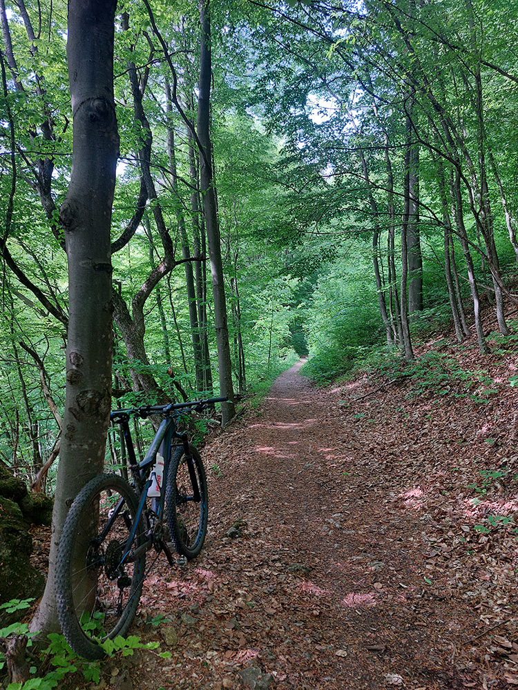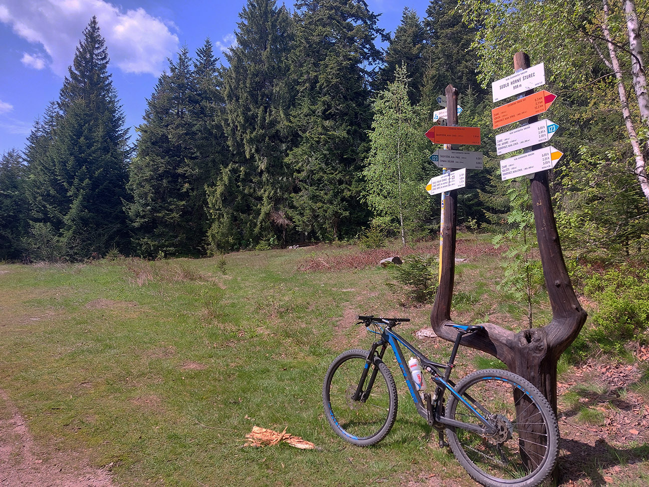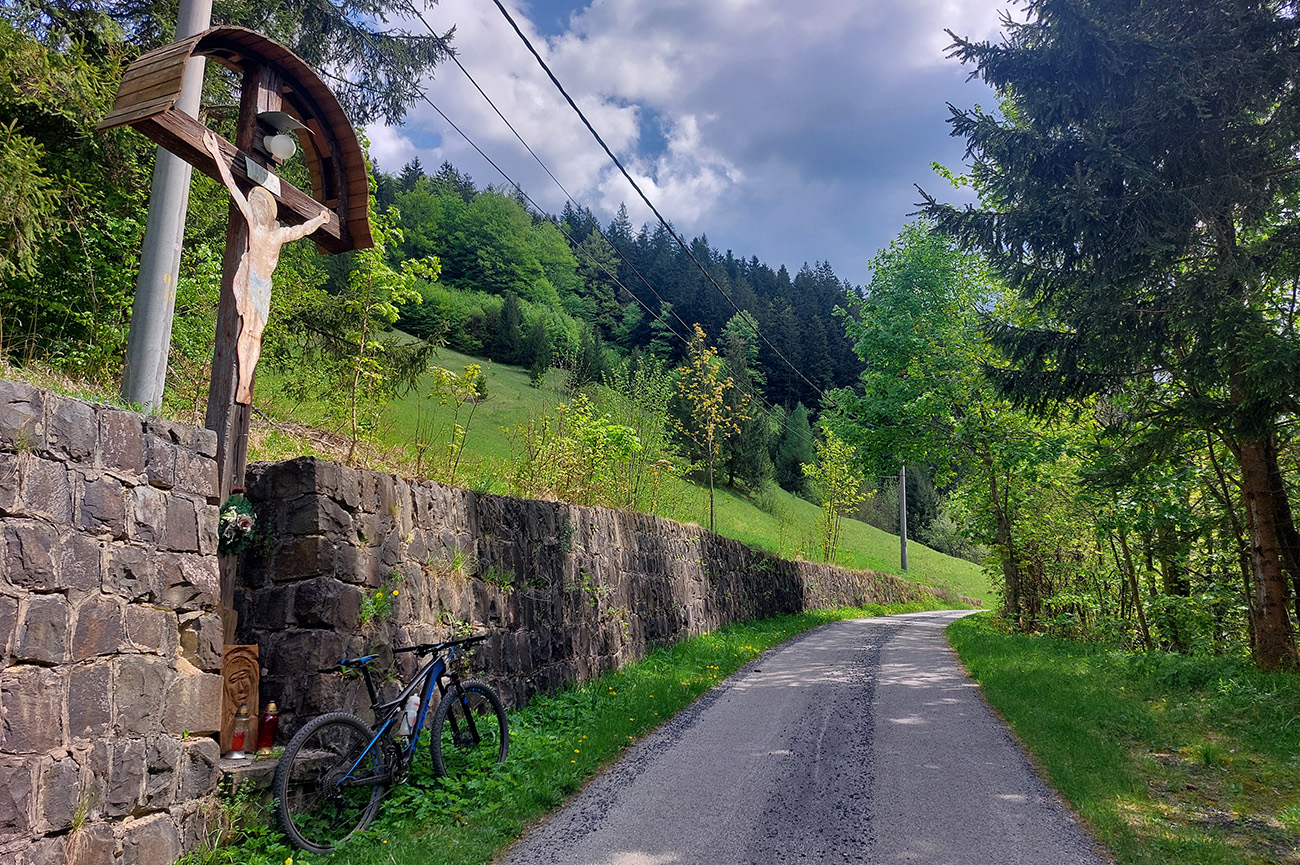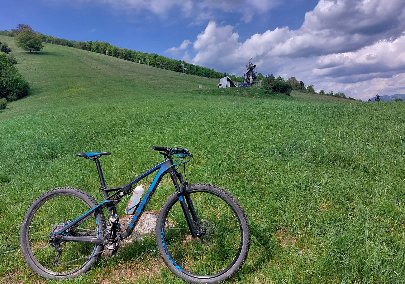 Hore na Krížnu je to už iná stena – a ešte vyerodovaná, aj keď stôp vyjazdených je tu dosť. Po úvodnej strminke za hotelom som preventívne dotankoval v napájadlách, zahryzol sa do riadidiel, zaradil „vyprošťovák“ a davááj hore. Ale nohy ešte silné a stúpanie je tu našťastie prerušované, s rovinkami na predýchanie. Vietor parádny, výhľady ešte lepšie, veď ako na holiach. Len tá technika pomalej jazdy cez šutre nič moc, trochu aj drina miestami.
