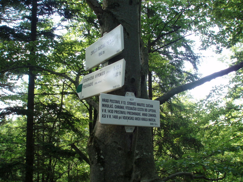 O niečo vyššie sa cesta rozdvojuje na dvoch miestach. Na oboch miestach choďte vľavo. Na prvom mieste ide cesta viac do kopca, no po chvíli sa opäť zmierni. Na druhom mieste budete prechádzať okolo posedu. Po chvíli prídete na Vápenicu, studnička (710 m n.m.). Na pravej strane pod stromami sa nachádza studnička. Ďalej pokračujeme po ceste a asi po sto metroch odbočujeme prudko vľavo do lesa. Miesto je dobre vyznačené ale pri chvíľke nepozornosti to môžete minúť. Chodník pozvoľne stúpa a akoby sa vracal späť. Neskôr sa zvrtne opäť iným smerom a to ste už na vrcholovej časti hrebienku, ktorý vás dovedie na vrchol Smrekové (890 m n.m.). Tu sa nachádzajú zvyšky Sučianskeho hradu. Dočítate sa tu aj niečo z jeho histórie.
