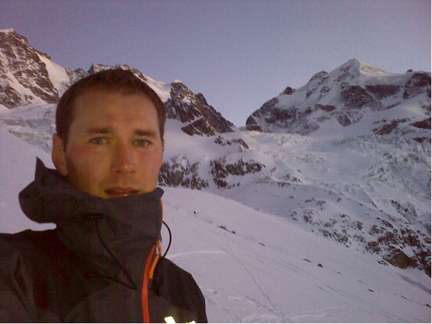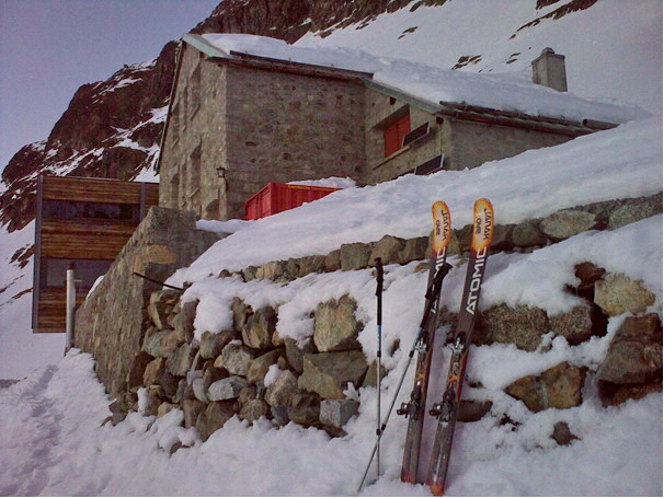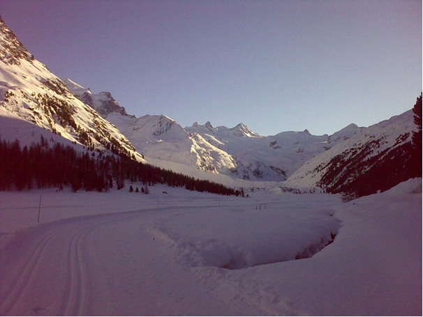 Cesta k Tschierva Hütte e trvá asi 1,5 hodiny . Hore som stretol ešte mladý párik, ktorý nocoval vo winterraume a samozrejme som sa „zakecal...“ Vraj sa plánujú ďalší deň pokúsiť o Piz Bernina cez Bianco Grad. Na zostup som sa vydal o 18tej a prvý otvorený úsek som zvládol ešte za svetla (šera), čo dole v žľabe už sranda nebola, lebo nebolo vidieť ani na krok. Napriek tomu som si prašan užil a na konci som si zjednodušil cestu po označenej bežkárskej trati, ktorá vedie pozdĺž celej doliny, skoro až k ľadovcom ...