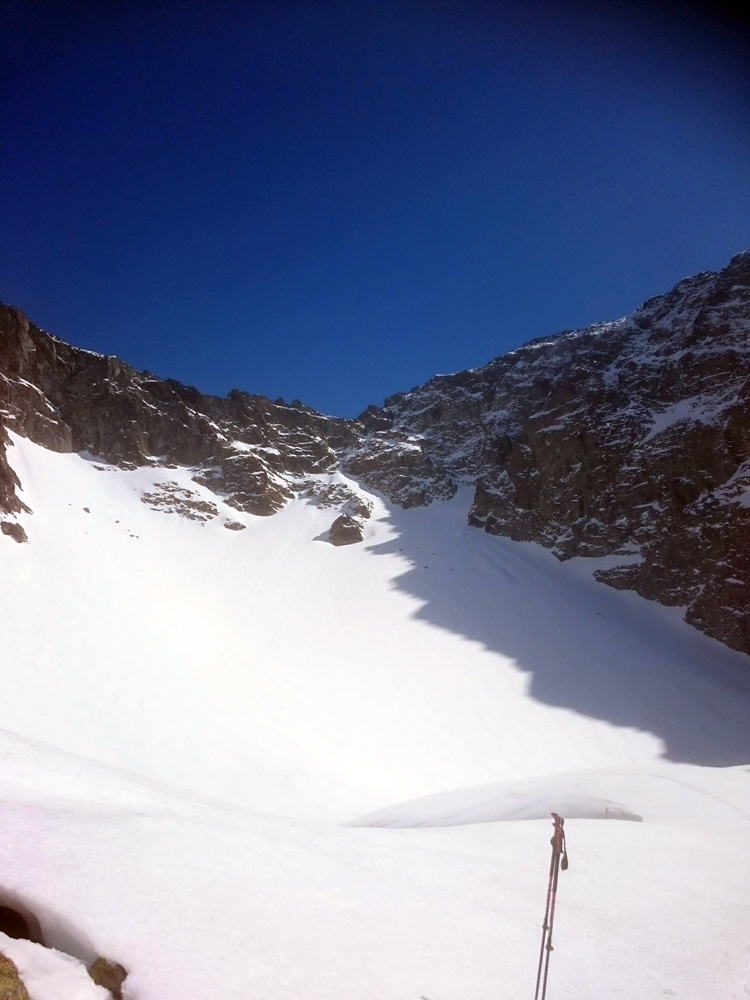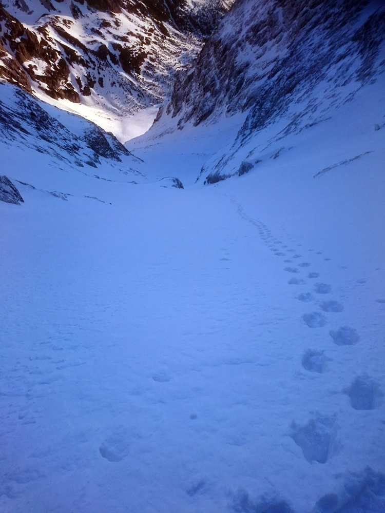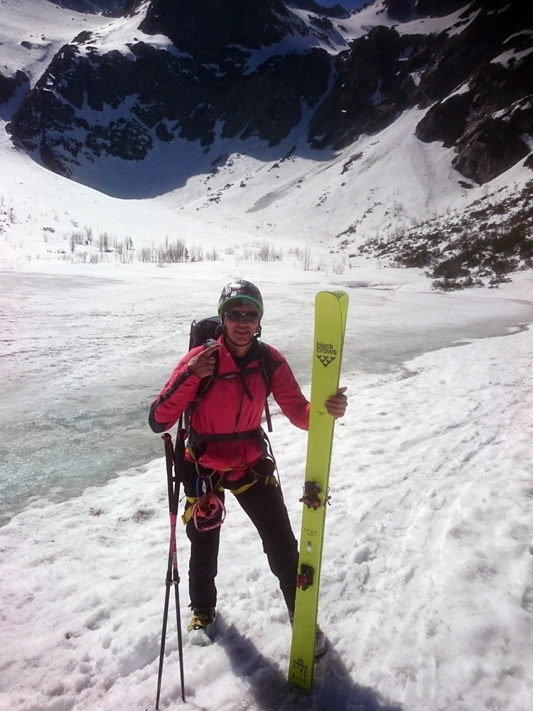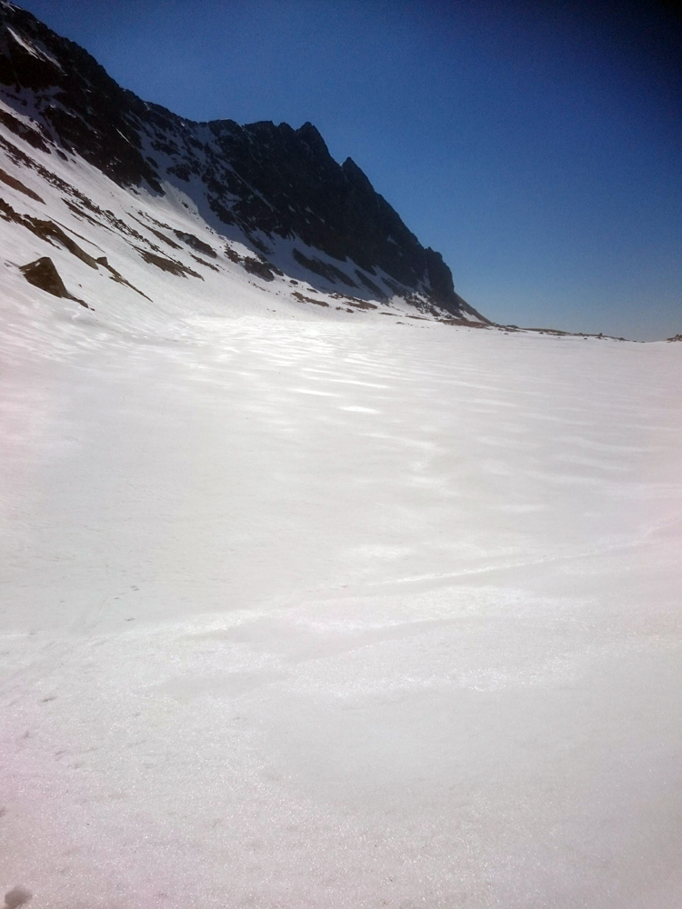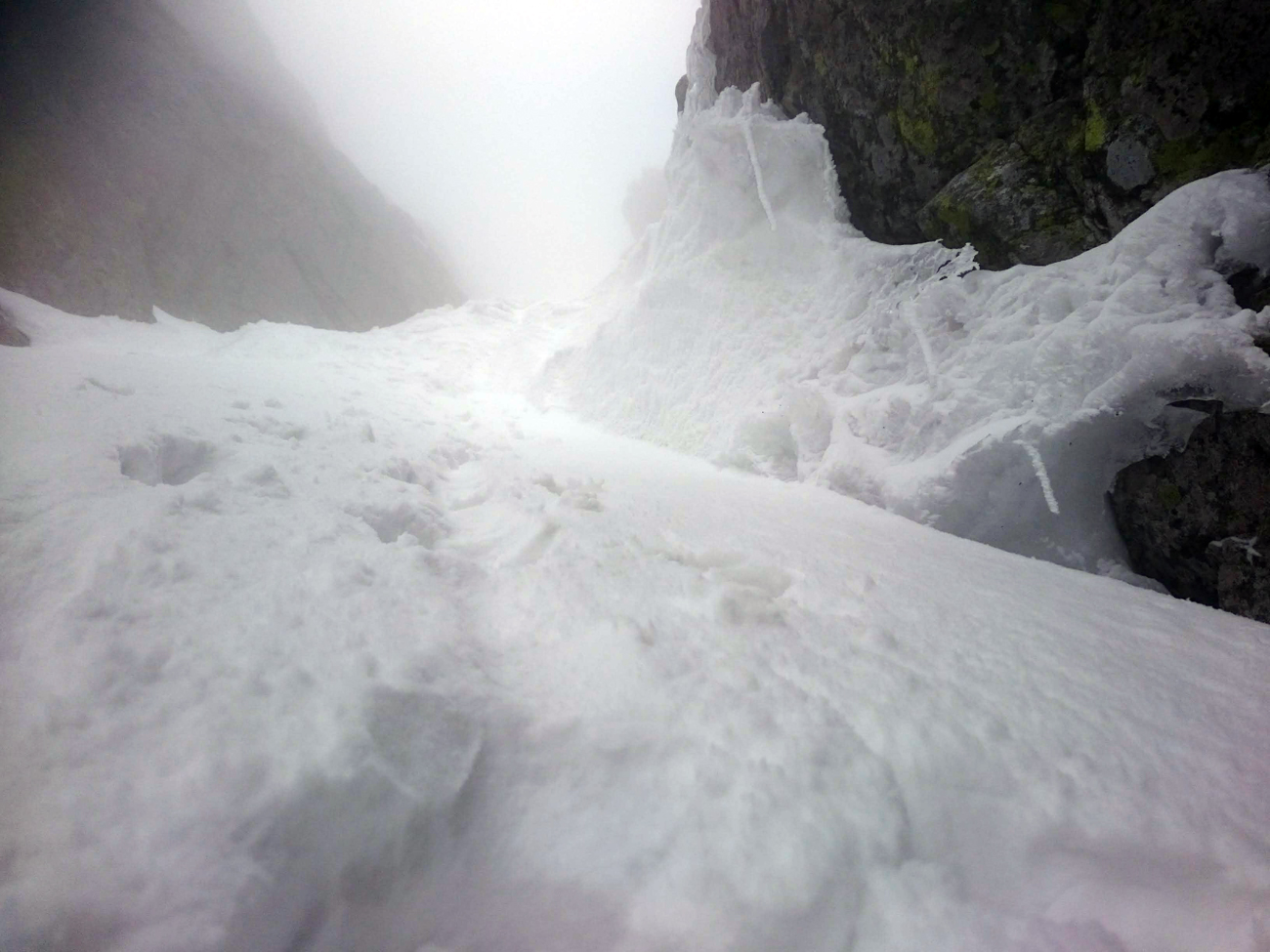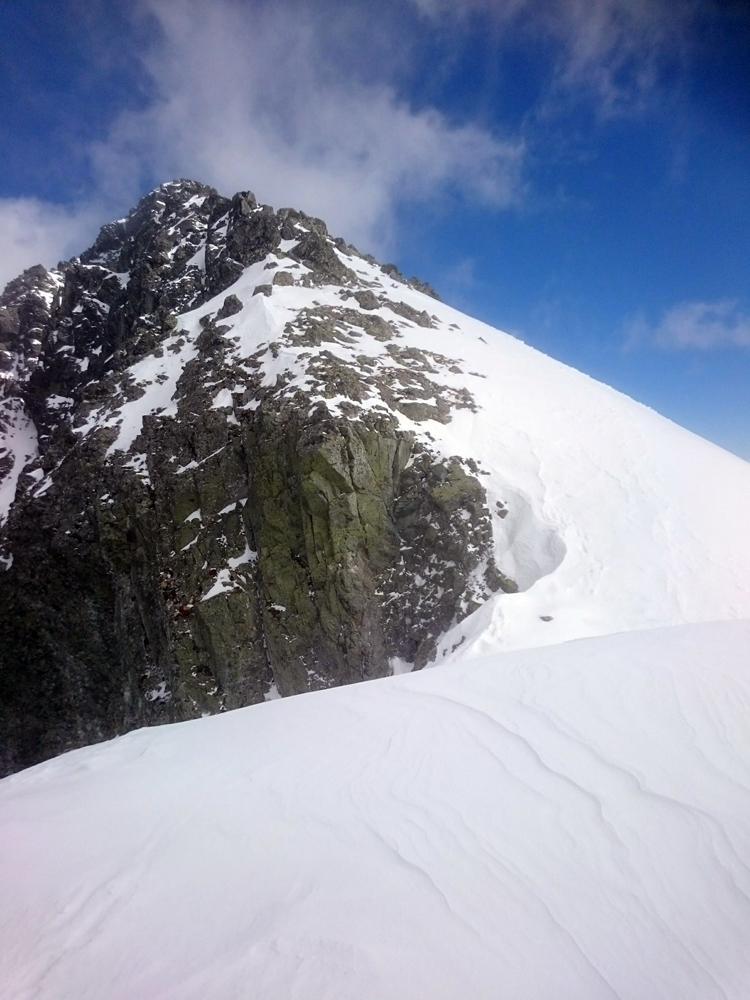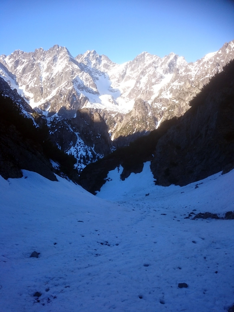 Pravou nohou po snehu, ľavou po skale a ťahám batoh na repke. Ide to. Druhý spád, pod snehom veľká bublina – pasca. Dá sa po skale, idem na istotu. Potom sa už venujem rozjímaniu a v pohode stúpam, sneh perfekt tvrdý. Občas poznať stopy po lyžiach a v duchu závidím autorovi oblúkov.