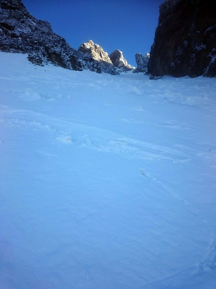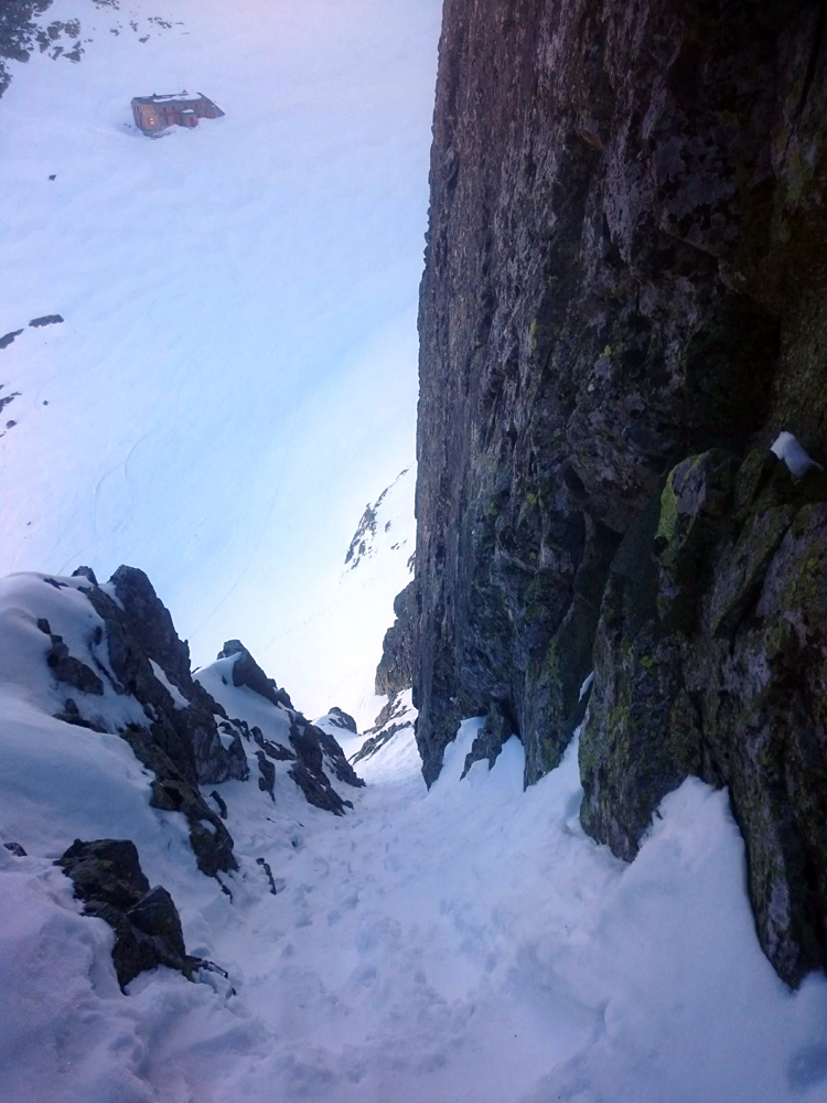 Idem na pásoch pokiaľ sa dá, je tu akási ľadová drť. Dávam mačky a hľadám líniu, kde sa to menej zabára. Konečne v sedle. Krátky odfuk a idem ďalej na mačkách (lyže neprichádzajú do úvahy). Vstup do žľabu: vidím prevej. Viem, že nižšie je to bez preveja, tak zostupujem. Obúvam lyže, prehupnem sa cez hranu a som v žľabe. Pocit nič moc, tak čo najskôr traverzujem cez rebro doprava.