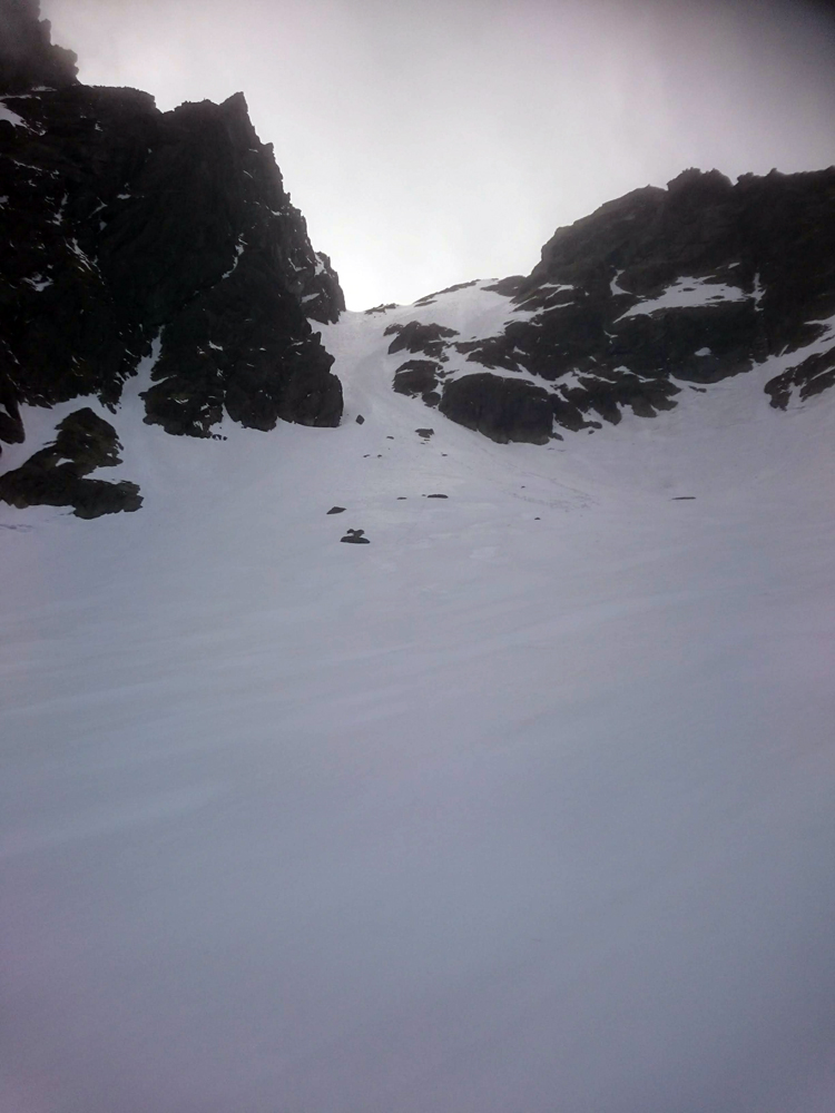 Celkom rýchlo som na pásoch pod žľabom do Zadnej Gerlachovskej lávky. Idem ďalej, borím sa do polky lyžiarok. Žľab je len môj. Pohľad zo sedla nepotešil, treba mačky a cepíny. Naivne zhadzujem pásy, že ďalej bude lepšie. Opatrne zostupujem. Na mieste, kde by sa dali obuť lyže, je polka žľabu vypadnutá. Ostáva tvrdý hrebienček, po kraji sa dobre zostupuje, no o chvíľu aj ten končí a pokračuje žľab s minimom snehu. Až sa niekde posúvajú skaly pod nohami.
