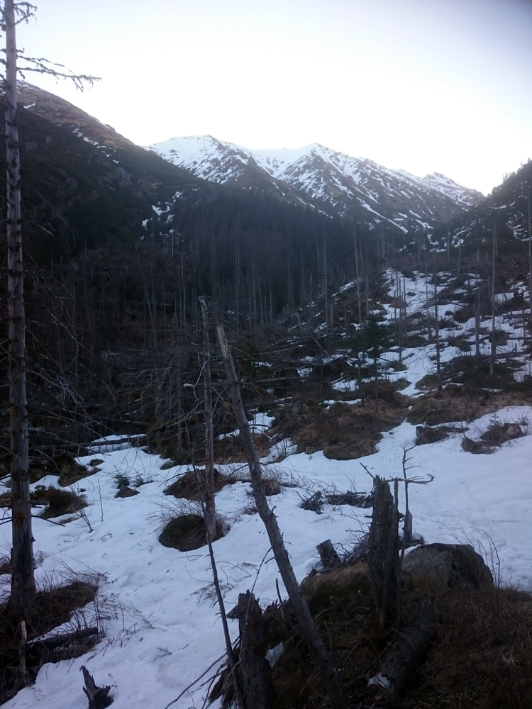 Tretí deň: 6:15 odchádzam po chodníku smer Rovienky. Križujem potok, ešte je poznať stopy po lyžiach. Idem skúsiť, sneh perfekt chrumkavý. V prvom veľkom spáde úzky, tenký pásik snehu prerušený. Zhadzujem batoh a idem na prieskum nad prerušením. Sprcha a namäknutý sneh, s batohom to nedám. Batoh, lyže a palice zviažem, aby sa nič nezachytilo.