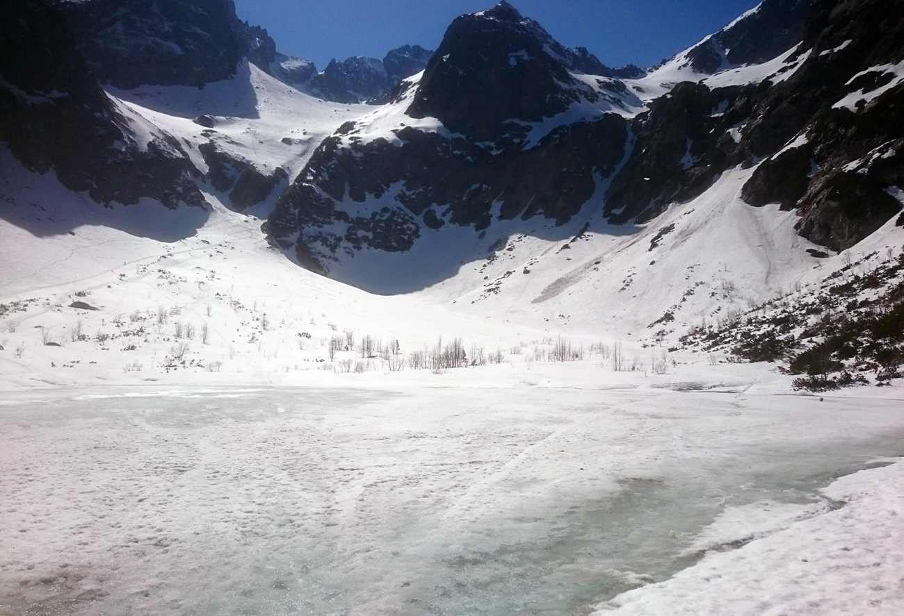 Dávam pásy a horným chodníkom sa vytraverzujem tesne pod hranu Czarneho stawu. Za plesom zastavujem, až keď treba prezúvať. Spodný traverz je na slnku, ale aj tak som mal v pláne horný variant, t. j. letný chodník, pod stienku po snehu. Stienka mokrá skala, v priamej línii je to mor. Dostávam sa nad a z opačnej strany vidím dve serpentíny chodníka. Ďalej pokračuje nepríjemný traverz okolo dvoch borhákov, orientačne som dobre.