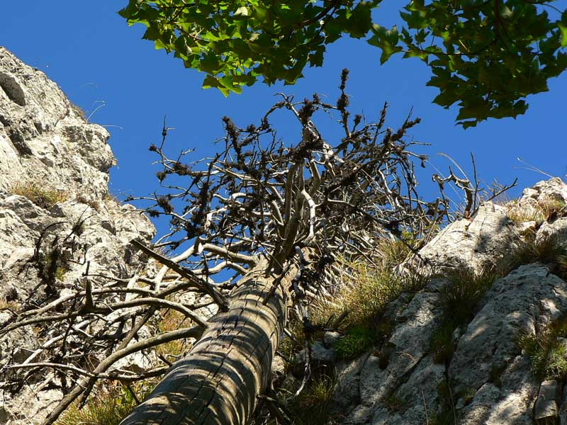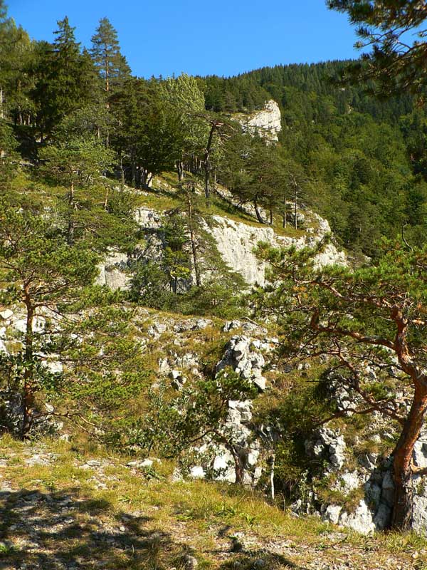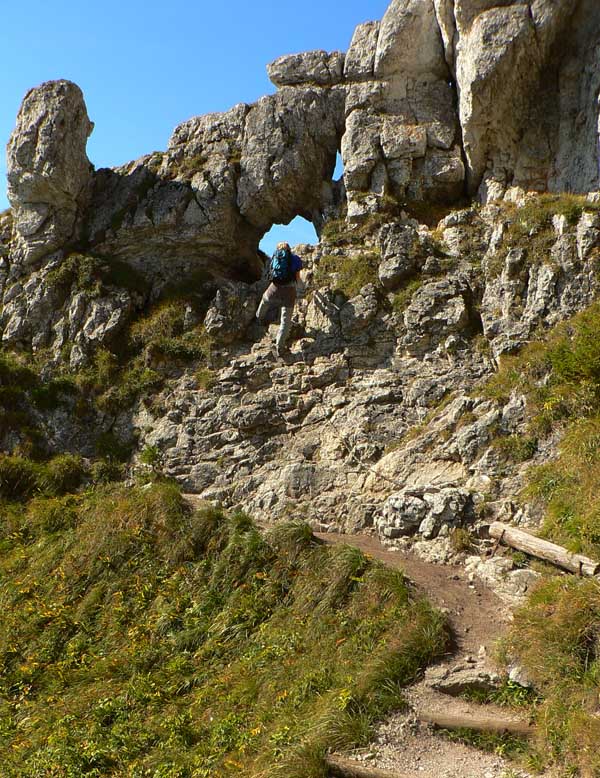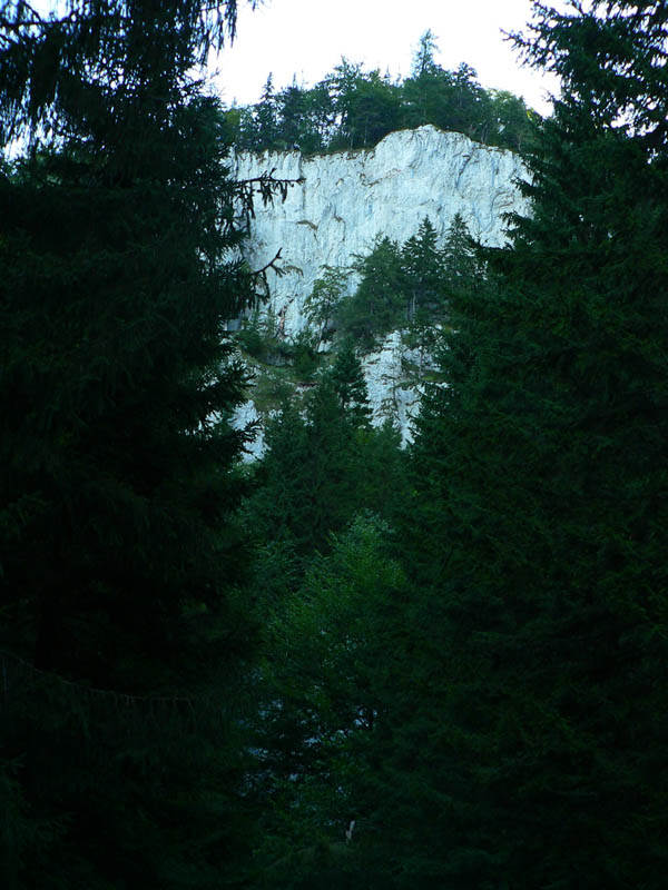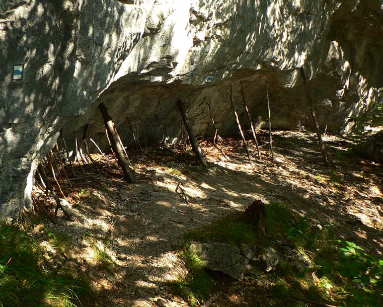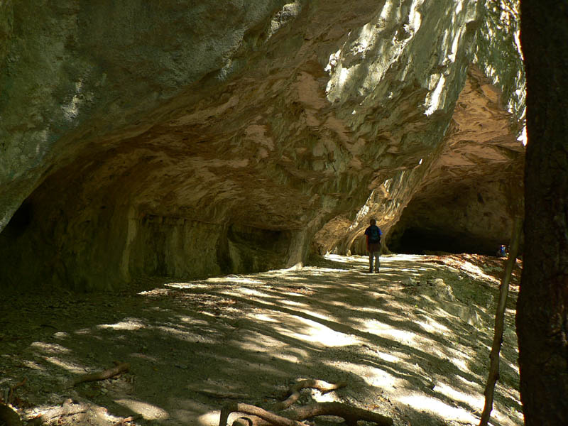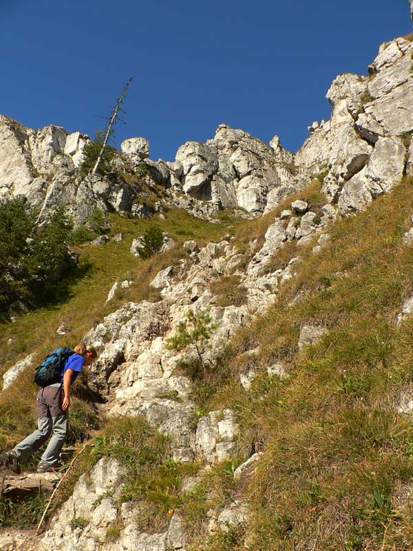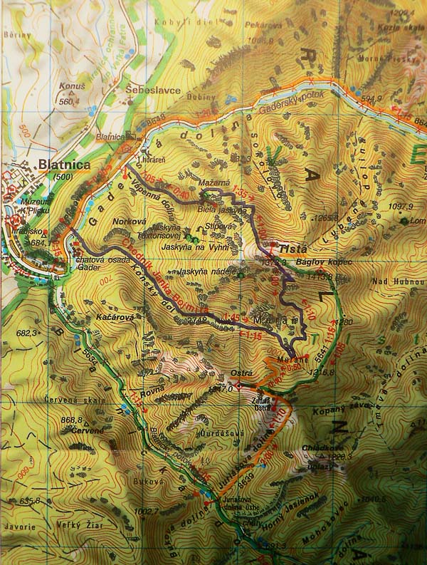 Oproti skalnatej špičke Ostrej je trávnatá plošina Tlstej ako futbalové ihrisko, aspoň sa tu počas pekných víkendov masa turistov roztratí. Cesta nazad k už spomínanému smerovníku v Konskom dole (po modrej) vedie odtiaľto popod aj ponad majestátne vápencové terasy s pohľadmi na bralá nad Konským dolom. Smerom do Gadera je to podobné, aj keď niekedy brutálnou strminou, kde je navyše za mokra dosť klzko vďaka blatu a obnaženým koreňom. Asi v polovici zostupu ale čaká odmena - mohutný skalný previs so známou jaskyňou Mažarná, ktorá je významnou archeologickou aj zoologickou lokalitou. Vchod široký, vstup zakázaný - škoda že tabuľka je tak šikovne umiestnená (a taká malá), že si ju málokto (prichádzajúc z nášho smeru) všimne. Ako my, len náhodou už po vyjdení z jaskyne. A mnohí zákaz isto ignorujú. Nad Mažarnou na suchých vápencových terasách je pár upravených miest na oddych a výhľady na sever do kotliny. Práve takéto terasy sú typickou črtou celého masívu Tlstej a na viacerých miestach ukrývajú nejeden botanický unikát. Úsek pod Mažarnou smerom do Vápennej doliny je už príjemnejší, okrem prvého strmého zostupu. Od napojenia na asfaltku v Gaderskej doline je to do dediny pohodlná polhodinka.