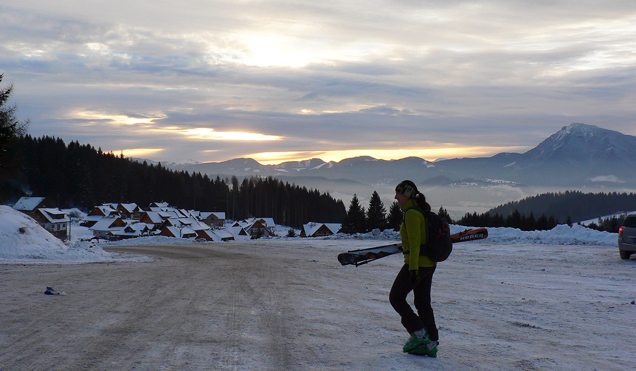 Šiesty január, pondelok trojkráľový, koniec sviatkov, treba ešte využiť. Zvlášť, keď predošlé dva dni nadzigalo prašanu – a dokonca aj v dolinách, aspoň teda na severe. Jedno auto a traja ľudia – konečne nie som odkázaný na spoje! Obratným a nenápadným manipulovaním utvrdzujem zvyšných dvoch, že Kubínka je ich nápad a najlepšia voľba :-) Parkujeme na najvyššom parkovisku, ešte je miesta dosť, vleky začnú ťahať o hodinu. Ku krvavočervenej zore nad Chočom sa otáčame chrbtom a len pár metrov od auta sa noríme do lesa po parádnej stope. No, parádnej – je vidieť, že sneh napadal na „nič“. Okolo rozprávka ako z Mrázika, no pod nohami presvitá premrznuté blato. Ale na výstup komfort.