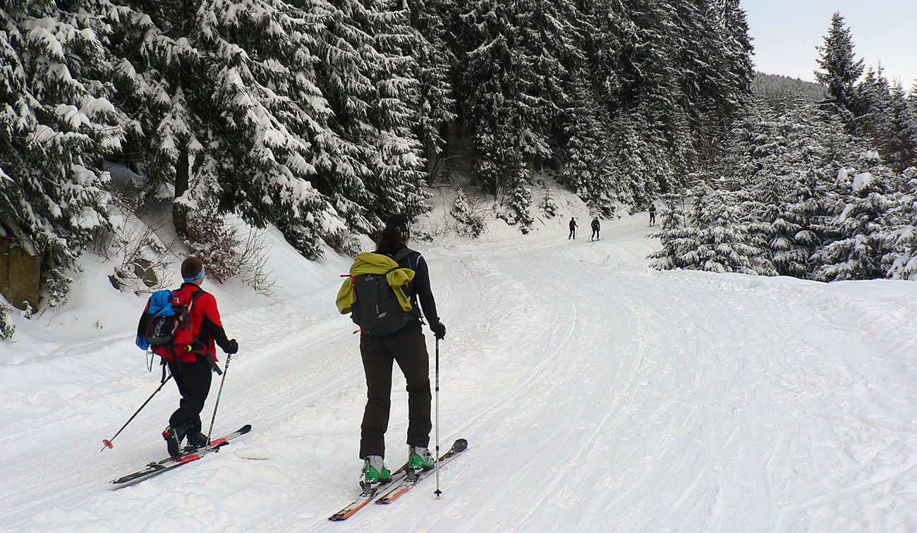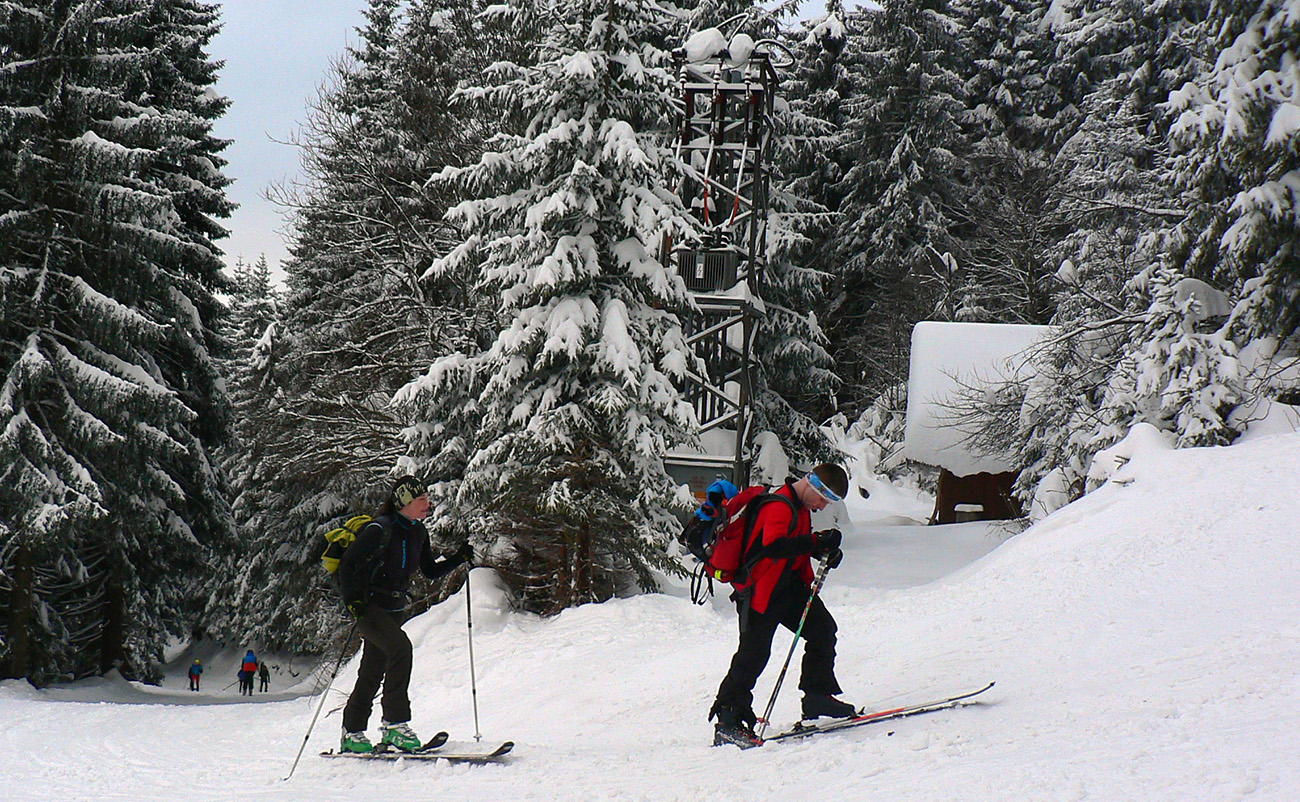 Čím vyššie, tým hlbšie koľajničky, tu na Orave ozaj nasnežilo pekne! Skratky lesom komfortne vycikcakované, diaľnica k chate komfortne poratrakovaná, cikcaky frírajdovým lesom pod hrebeňom (väčšinou) komfortne naklonené. Prví púdroví jazdci už sa spúšťajú okolo nás, po kolená v prašane, pochvaľujú si. Aj keď niekde za nimi presvitajú jafury.