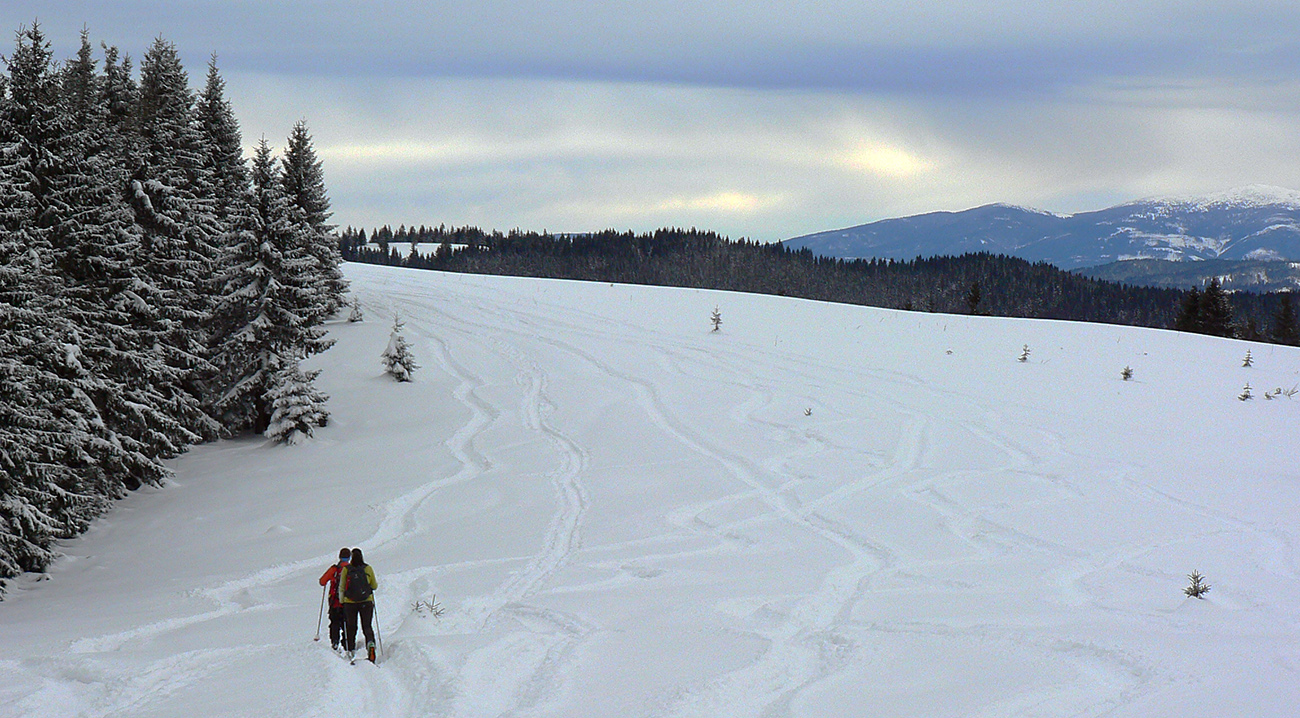Lúky na Vasiľovskej holi sú po motorovom dementovi poorané tiež poriadne, ale naša stopa zachovaná, pred nami aj za nami ju dosť ľudí leští. A výhľady aj tu super, najmä na sever, kde Babia hora schováva hlavu v mrakoch. O chvíľu sme pri vleku a o ďalšiu chvíľu už štrikujeme dole po zjazdovke. Na otočke drevená koliba, tučný kocúr, desiatové polievky a ide sa nazad. Pekne slušne po okraji pisty, popod les.