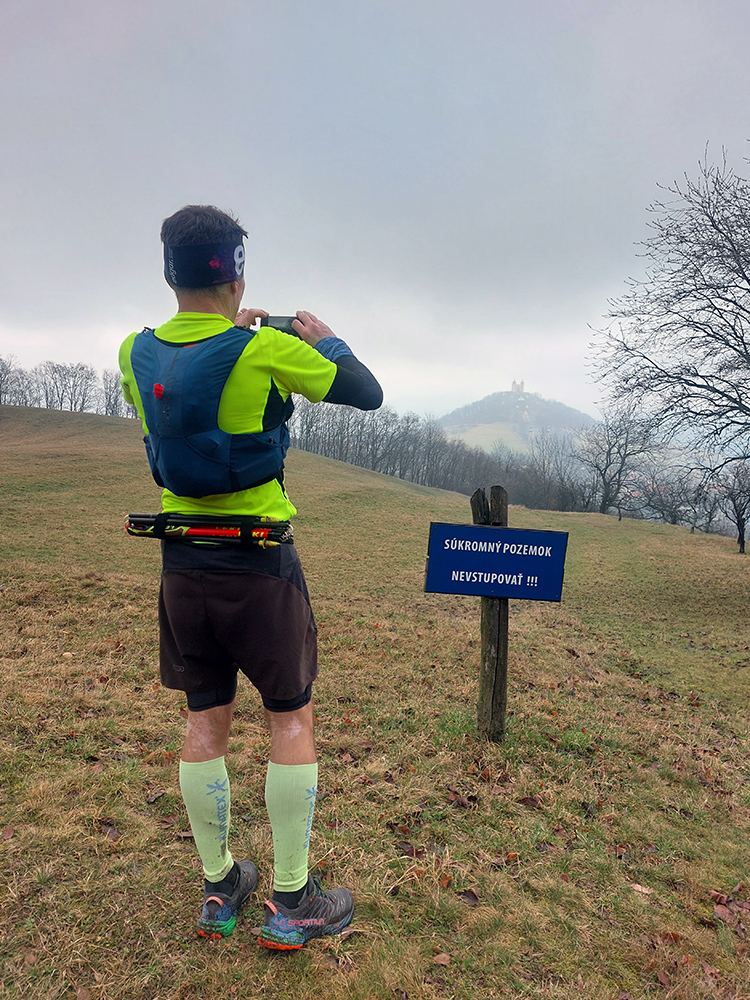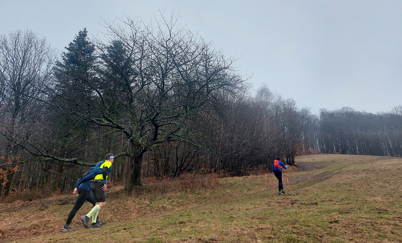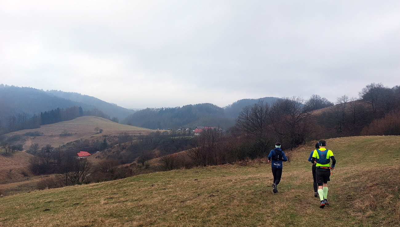 Krátky úsek bez značky, zväčša po lúkach, potom obchvat osady Zvotle a krátko do kopca k náučnému chodníku Kysihýbel – taká spojka, aby sa nemuselo po ceste, kade ide značka. Miestne psiská zalezené, max že sa rozčuľovali spoza plota. Niektoré vyzerali ako krátko pred infarktom, lebo veľa ľudí im tadeto popred nos asi nebehá, ale hádam to prežili. Na zákrute náučného chodníka krátka pauza na prejedenie a na výber – či sa ide dole do Kysihýbľa po pravej, či po ľavej strane doliny. Odhlasovaný bol pôvodný (ľavý) variant, natiahnutý v hodinkách, aj keď ten druhý bol asi krajší.