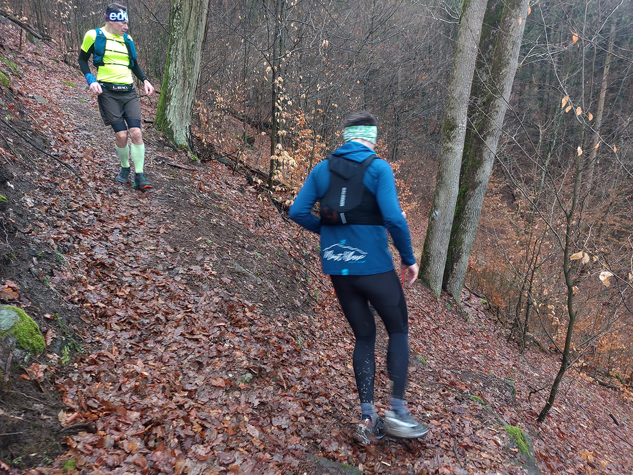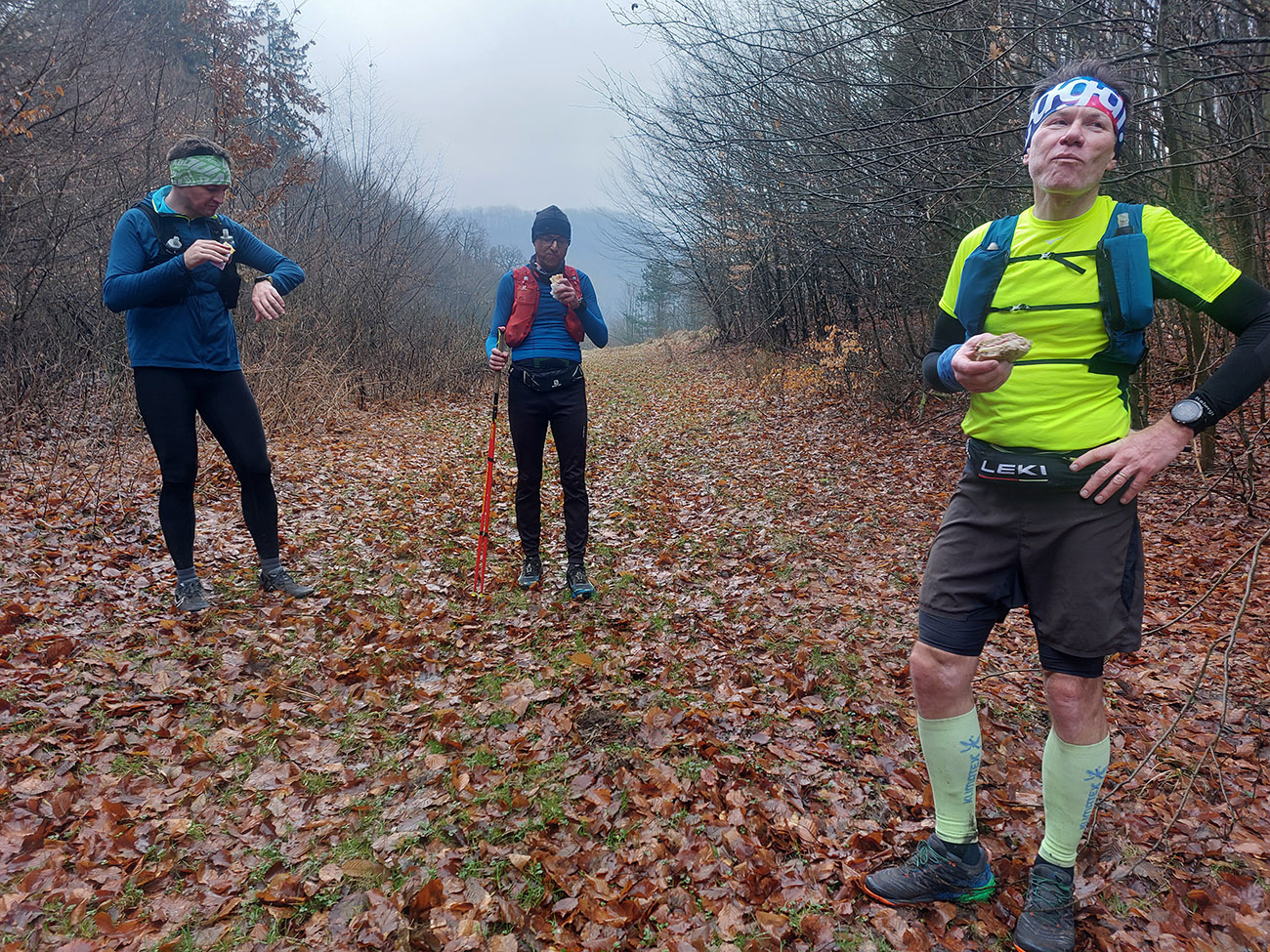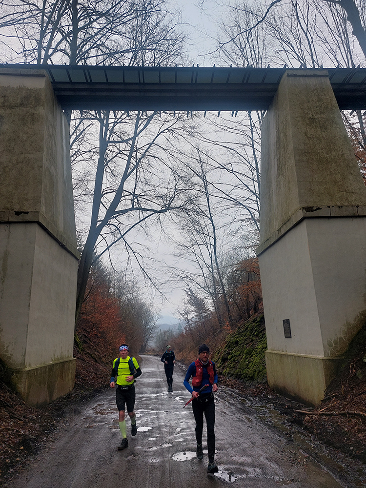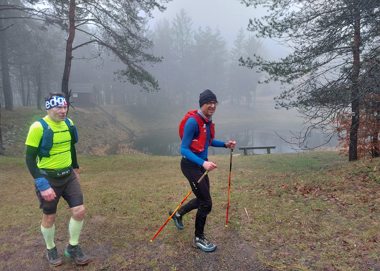 Z Volárskej dlhý zbeh po zelenej ku Kolpašskému tajchu. Zase všetky druhy povrchov, už aj nejaké kľučkovanie po rozbahnených úsekoch, no stále pohodičkové lesné cesty. Aj keď na psí vkus chlapci nejako rýchlo prášili dole kopcom. Výhľady do diaľok sa vďaka sivote nekonali, ale tam aj tak väčšinou zavadzia les. K vyhliadke z cesty na tajch kratučká zachádzočka, nech je fotka na titulku a pre manželky ako dôkaz, a išlo sa ďalej.