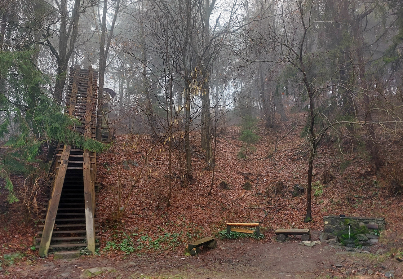 Zaujímavo naplánovaná bola spojka z Hájika na náučný chodník na Glanzenberg, aby nebolo treba do mesta zachádzať. Na mape bol síce nakreslený akýsi strmý chodník pomedzi Michalštôlňu a Hybalku (700 m), no v realite tade akoby už poriadne dlho nik nešiel. Použiteľný však bol, aj v teréne zreteľný. No bez navigácie či by sme ho trafili? Zaujímavé sú tieto domorodé „psie chodníčky“. Každopádne, mohli sme začať obdivovať miesta najstaršej ťažby a pobytu miestnych baníkov. Aj výhľady na mesto a okolie: