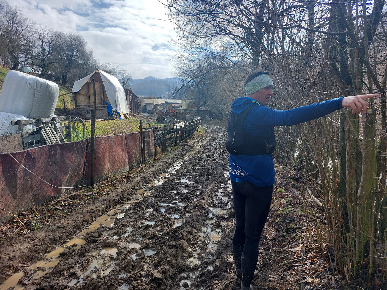 V Podhorí bolo treba dobrzdiť a predriftovať prudkú zákrutu okolo krčmy a trafiť druhú odbočku pomedzi domy von z dediny, na lúky. Posledný, klesavý úsek priamo do cieľa, nie dlhý, už proti slnku. Rozpačité boli očakávania (alebo skôr obavy), čo bude pod nohami, lebo podľa ortofotomapy to vyzeralo na typickú „poľnohospodársku spojku“, a ešte popri potoku. A taká aj bola. O zábavu sa postarali hore traktoristi z Podhoria a dole tí z Belej. Spolu so svojimi ovečkami (a s predošlým počasím, samozrejme). Ešte, že v úplnom závere viedla cesta potokom, bolo kde sa aspoň trochu oprať.