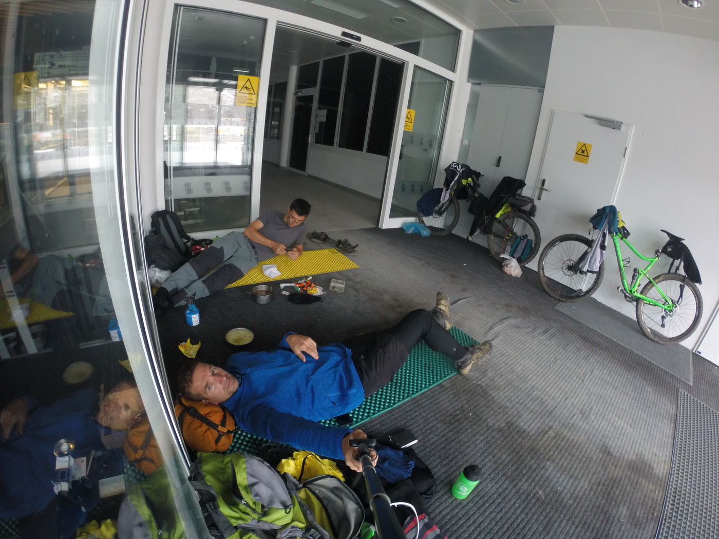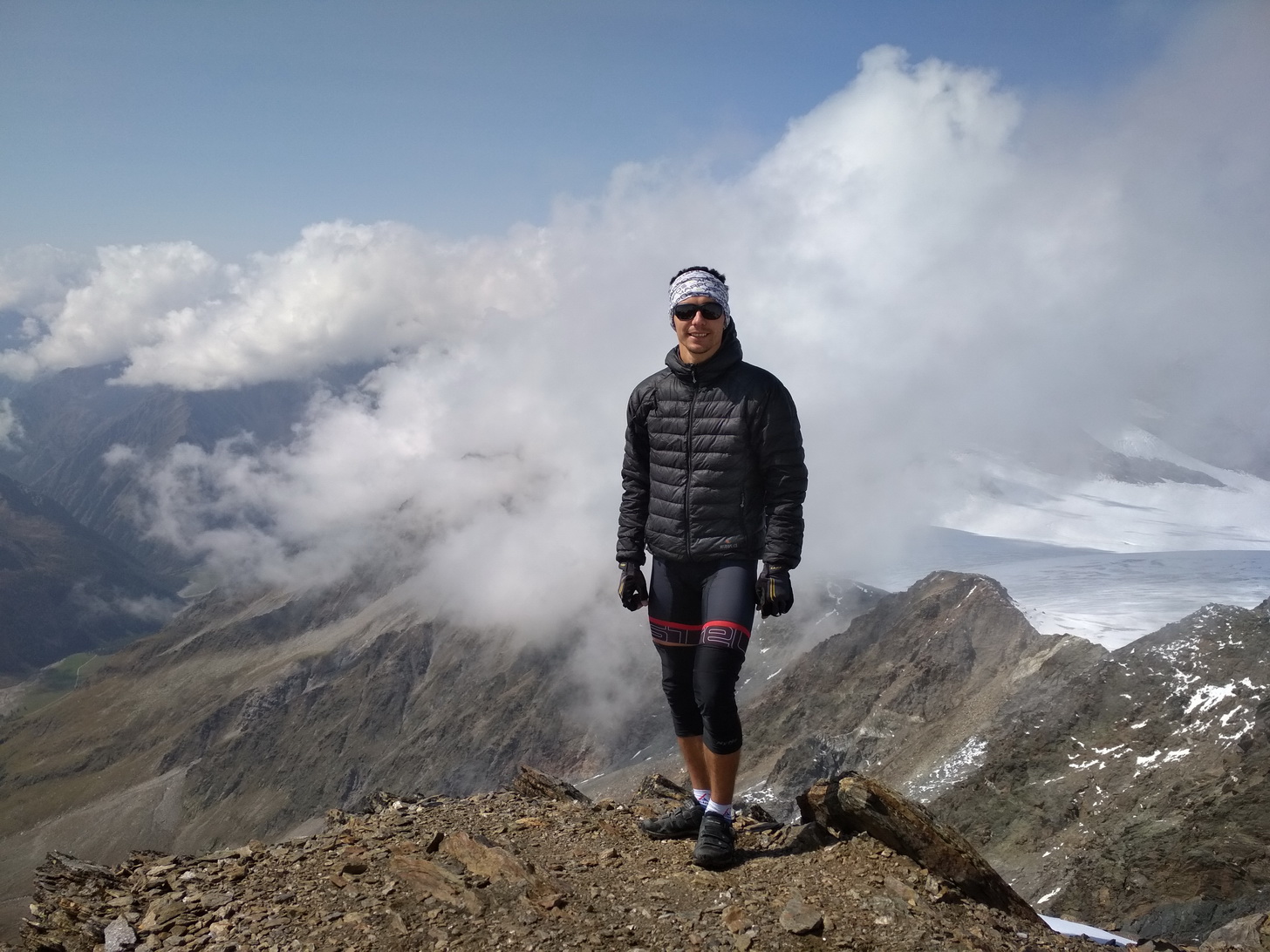 Tak som sa tam pekne v teple a suchu skryl pred dažďom a hodinku počkal Števa. Vedel som, že nie je najčerstvejší, a tak som ani veľmi nerátal, žeby sme ešte v ten deň šli cez sedlo o 500m vyššie. Števo prišiel dosť unavený, pršalo a sedlo bolo v oblakoch. Počkáme teda v tom vestibule, či sa počasie nezlepší a keď nás odtiaľ nikto nevyhodí, tak tu môžeme aj prespať. Vlekárom padla a v našom vestibule na koberci bolo príjemne, preto sme sa rozhodli stráviť tu noc. Vzhľadom nato, že ráno nás čakal výšľap do sedla vo výške 3150m a následne zjazd do Soldenu, ktorý je vo výške 1350m, tak som sa na ďalší deň tešil tak silno, že som z toho nadšenia nemohol v noci ani spať. To sa mi ináč stáva celkom často:)