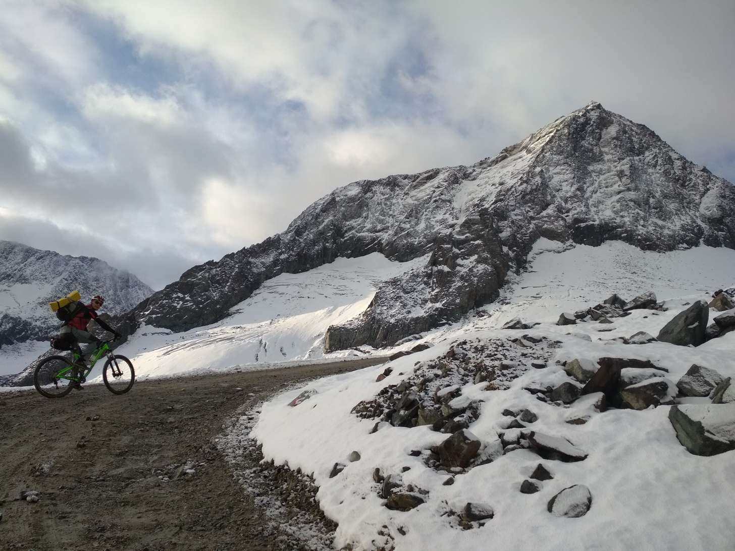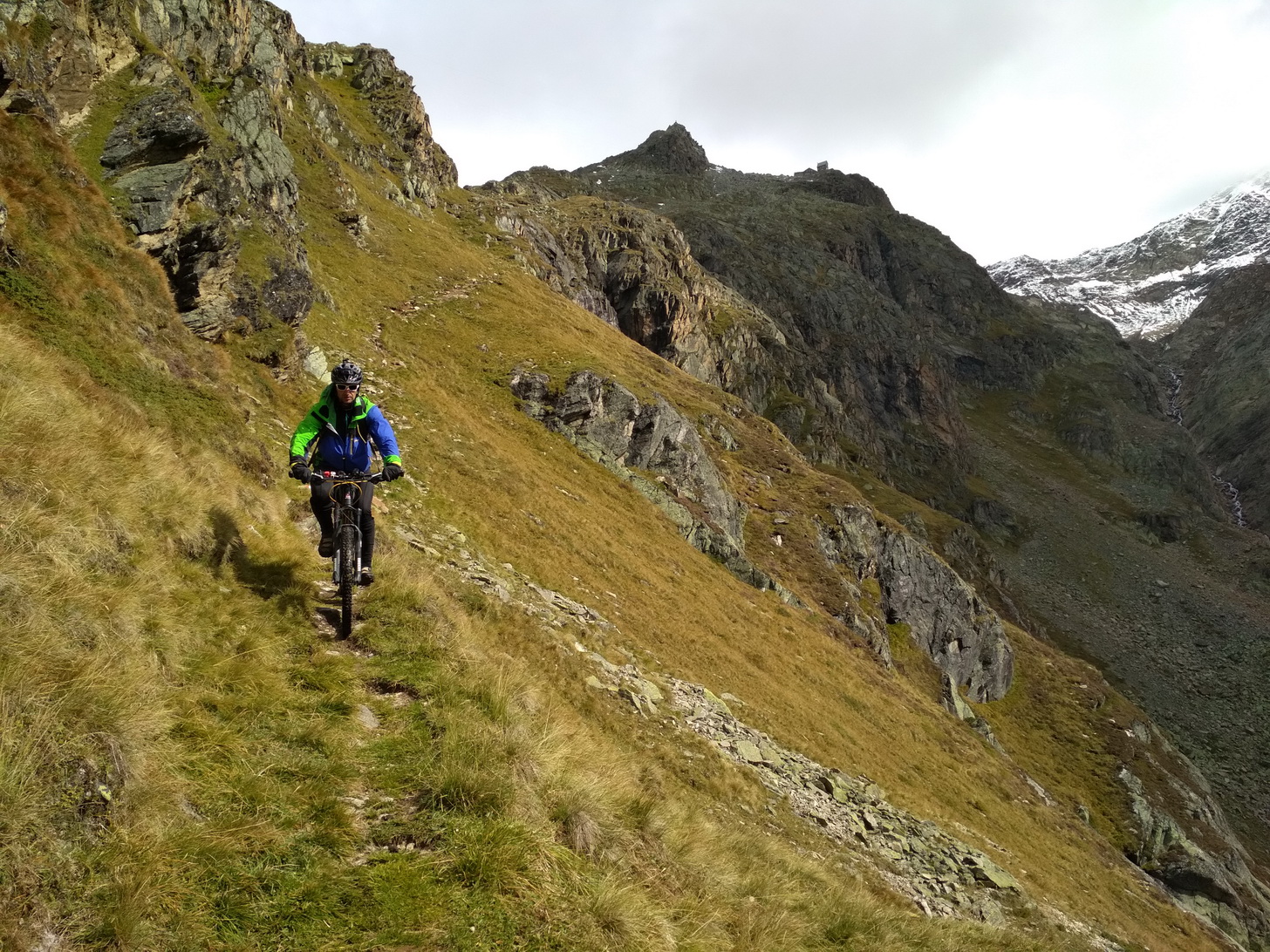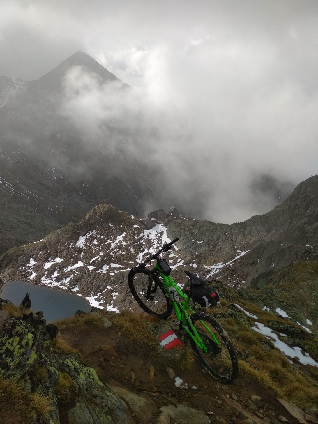 Na chatu sa šliape poriadne strmou šotolinou, avšak už zakrátko sa nám začali ukazovať pekné scenérie. Na chate sme sa o 18tej rozhodli, že skúsime ešte dnes prejsť cez sedlo Seejochl vo výške niečo cez 2500 m.n.m. Keďže sme štartovali vo výške 900 m.n.m., tak to bol vcelku slušný prvý výšľap. Záverečných asi 150 v.m. nám trocha cestu sťažil čerstvý sneh. Chodník vedie stúpajúcim traverzom v sutinovom svahu a aj keď na svahoch veľa snehu nebolo, tak práve na chodníku bolo aj 20cm čerstvého mokrého snehu, ktorým sa bicykel tlačil dosť ťažko. Práve sa začínalo stmievať, keď sme vyšli do sedla. Za svetla sme ešte stihli pozjazdovať pekné horné pasáže a tesne nad chatou Starkenburger Hutte, ktorá je vo výške 2200 m.n.m. sme nasadili čelovky. Mali sme so sebou aj karimatky a spacáky a jeden varič, aby sme mohli v prípade, že nestihneme prísť niekam na chatu, prespať niekde v senníku, čím by sme aj ušetrili nejaké peniaze.