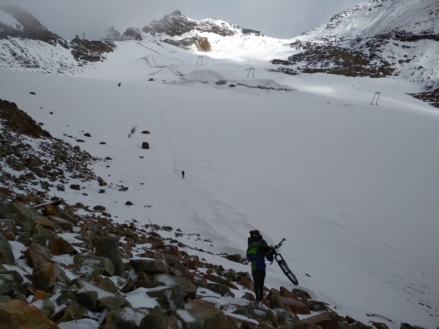 A veru. Nastalo ráno. Počasie bolo fajn a my sme mohli vyrazili. Najprv 250 v.m. strmou šotolinou a potom ďalších 250 po ľadovci popod vlek. Viem, že veľa cyklistov by to ohundralo, že trebalo hore ľadovcom tlačiť a že to vedie cez lyžiarske stredisko a že to už ani nie je cyklistika. To je transalp, kde sa prekonávajú alpské hrebene. Pre mňa to je NAJ, čo môžem v cyklistike zažiť. Boli sme vo výške 3150 m.n.m. a pod nohami sme mali dlhočízne alpské údolie, kde o 1800 v.m. nižšie keď skončí zjazd, tak máte od šťastia ten priblblý úsmev na tvári. Kým sme sa však dostali do Soldenu, tak sme najprv zjazdovali po ľadovci popri ratrakoch. Už pripravovali snowpark na zimu. Potom sme niesli po balvanoch, potom sme znášali po oceľových lanách na chatu Hildesheimer hutte. Tu pekne ranná kávička a ide sa ďalej. Trail z chaty do údolia je veľmi ťažký.