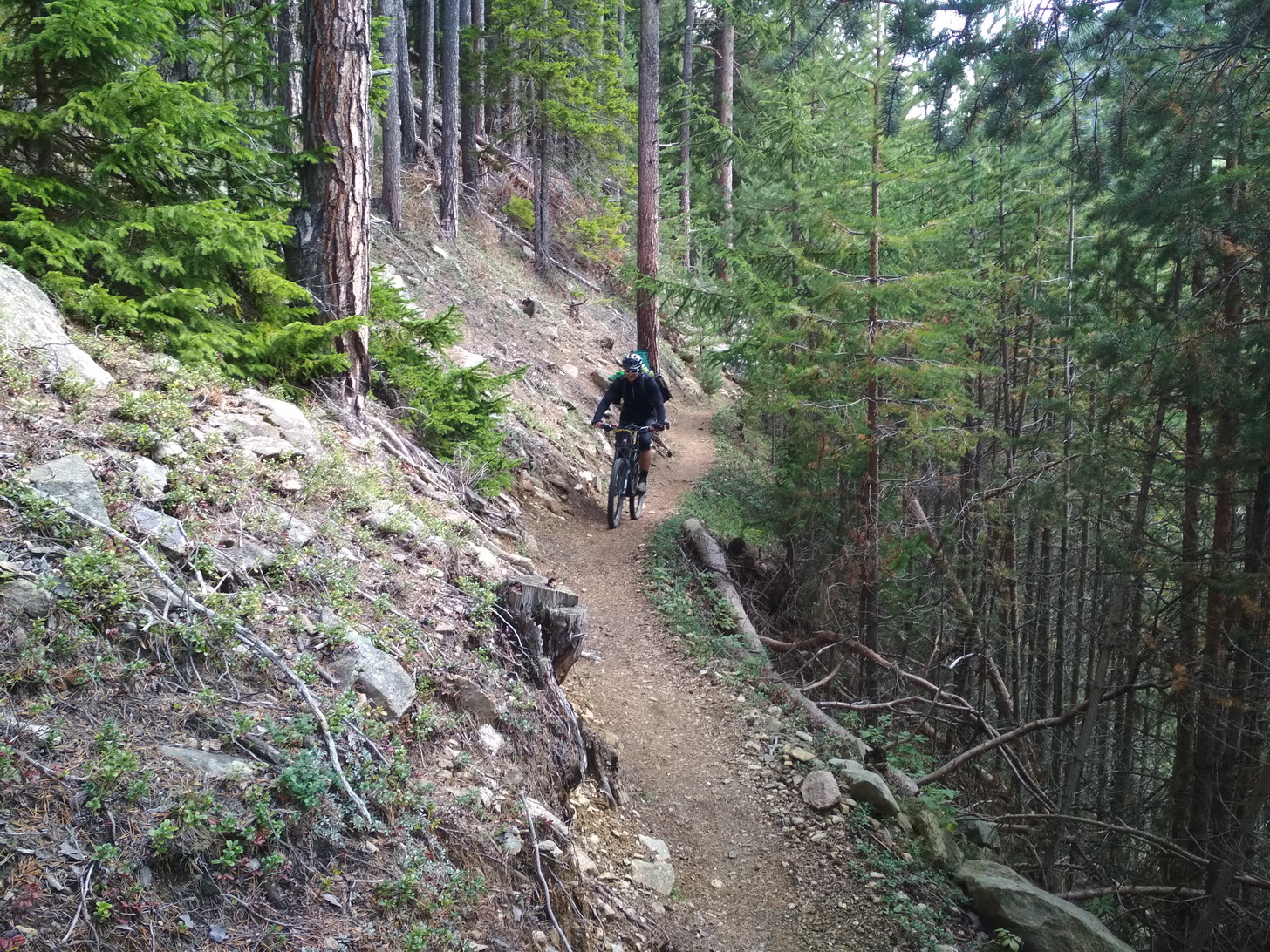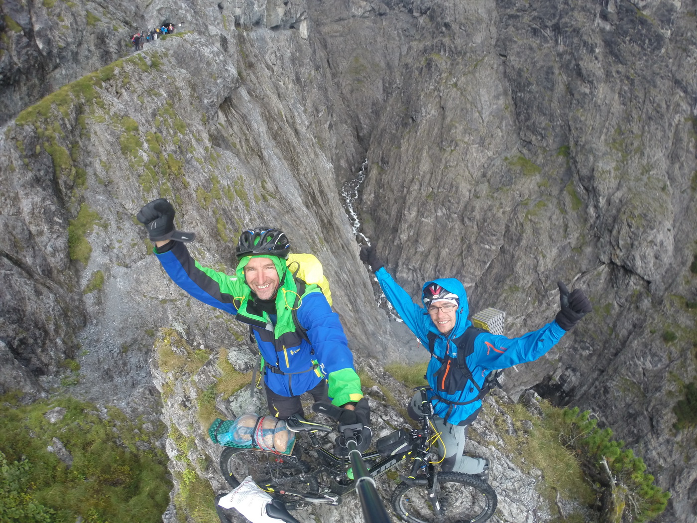 Hneď prvú noc sme sa teda aj napriek prítomnosti iste pohodlnej horskej chaty rozhodli prespať vonku. Našli sme si vhodný prístrešok, ktorým bola už nepoužívaná chata Knappenhutte a tam sme sa uložili na starých stoloch pekne pod strechou terasy. Bol to parádny bivak, no Števo ma v noci vystrašil nejakou nočnou morou a ráno sa priznal, že takto vonku ešte nespal, akurát tak v stane v lete na Šírave. Ráno pekne raňajky a už sme si aj našli to, prečo sme sem prišli. Nie zjazd po šotoline, ale do údolia pekne nenápadným chodníčkom, aj za tú cenu, že občas je tu riziko, že budete bicykel znášať nezjazdným terénom. Raz som už znášal aj dolu ferratou:) Tento chodníček sme však trafili parádny a za odmenu sme mali hneď na ráno 800 v.m. trailu do mestečka Neustift im Stubaital. Tu som si chcel kúpiť cyklorukavice, no mali len ferratové, tak som zobral tie.