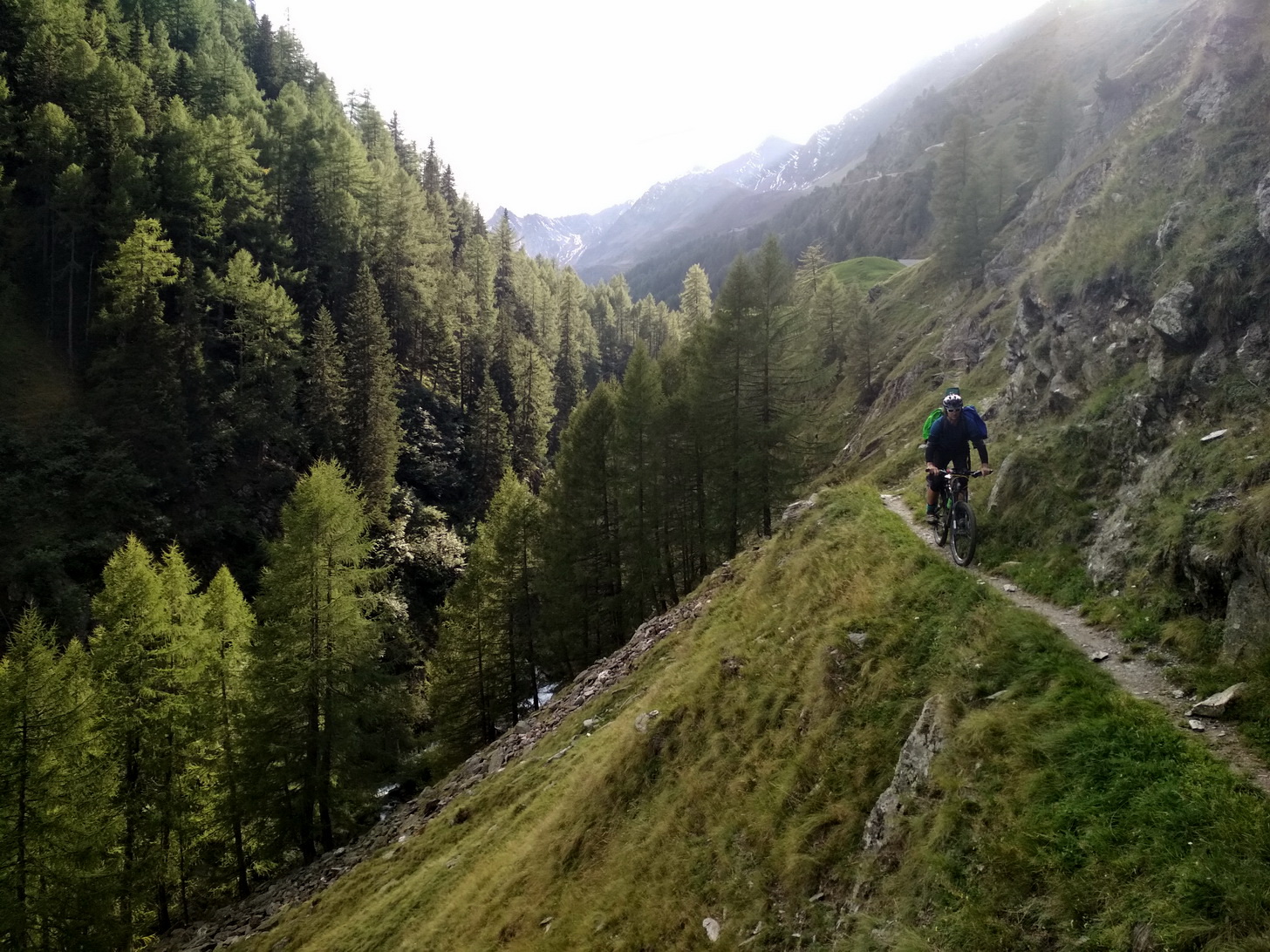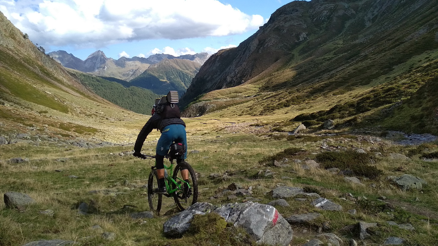 Inač Eisjoch a Hohe Wilde odporúčam aj ako výlet s manželkou. Prekročíme sedlo a už nás čaká 2300 v.m. zjazd. To nie je pre nikoho zas až tak úplne bežné. Zjazd zo sedla smerom na západ nie je technicky náročný. Je to, akoby som to opísal - fantastické, škoda reči. Kto nezažil MTB v Alpách, prichádza o jeden osobitný rozmer cyklistiky. Pre mňa je to topka. Kým zozjazdujeme na parkovisko, Števo ešte presekne bezdušák. Locus nám opäť pomohol v tom, že nemusíme strácať výšku po asfalte, ale môžeme si to ďalej užívať po singletracku, hoc aj kravami zamínovanom. Na záver je aj strmý asfalt celkom vzrúšo. Cesta z údolia sa pripája na hlavnú cestu smerom do Kurzraz odkiaľ som pôvodne chcel prejsť cez hory k Rechnenpass, ale cestu v mape som nenašiel, tak ak niekto o nejakej rideable ceste viete, tak poraďte. Zjazd k hradu Juval si ešte spestrím krátkym výšľapom do Karthaus a zjazdom mimo asfalt.