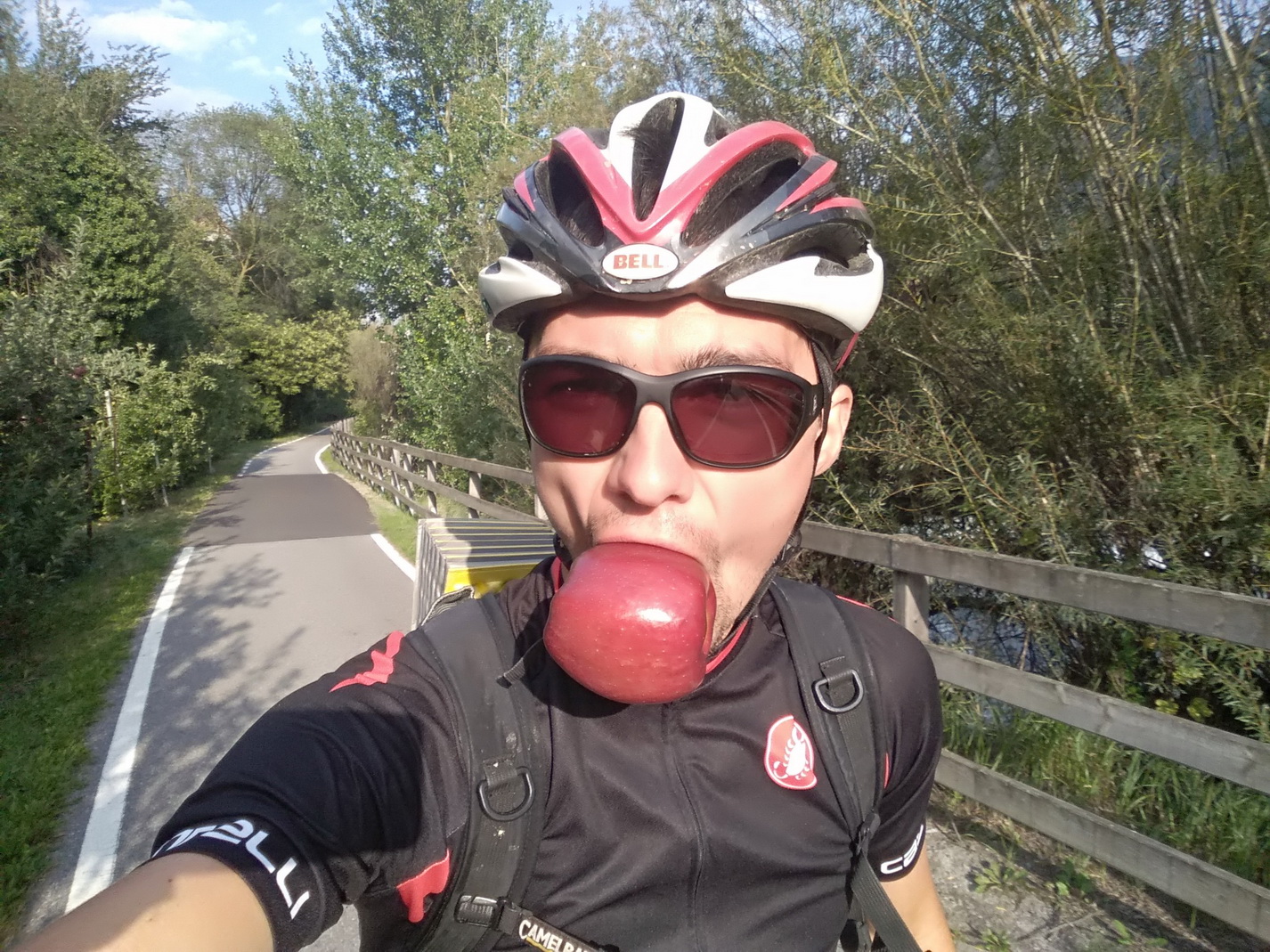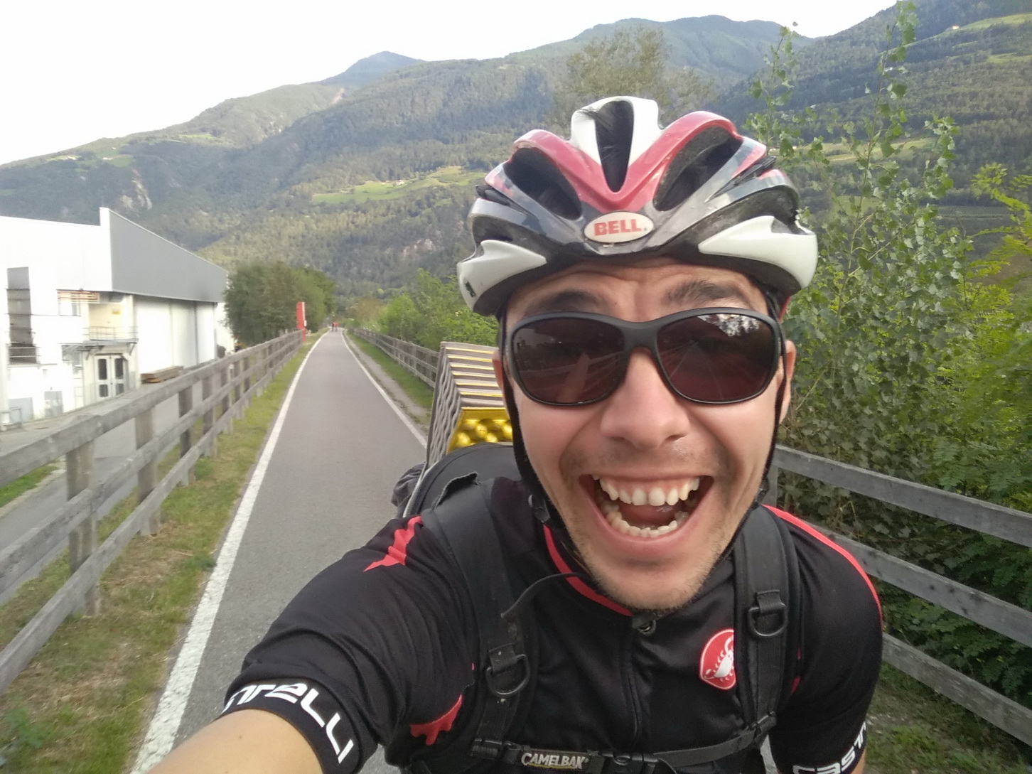 Keď zrazu človeka tunel vypľuje medzi jabloňami v nadmorskej výške 600 m.n.m., je to iný svet. Sme na cyklotrase vedúcej na Rechnenpass. Pohoda. Jablká, zastavíme sa na koláčik a keď sa blíži tma, tak reku, že prespíme v Prato dello Stelvio. Lenže tu sa práve nasledujúci deň koná nejaký Transalpine run, takže všetko ubytko je obsadené. Napokon som cez booking zarezervoval hotel s raňajkami v dedinke Schlinig 12 km od Prata. Akurát sa stmieva, tak si myslím ok, po asfalte tam do pol hodiny musíme byť. Lenže pozerám ja lepšie do mapy a zrazu som si uvedomil, že to síce je už len nejakých 9km, ale zároveň je to o 750m vyššie. Aspoň je to smerom, ktorým zajtra pokračujeme, takže čelovky na hlavy a poslušne točiť pedále a o desiatej večer sme tam. V ten deň to bolo napokon 4200 v.m.