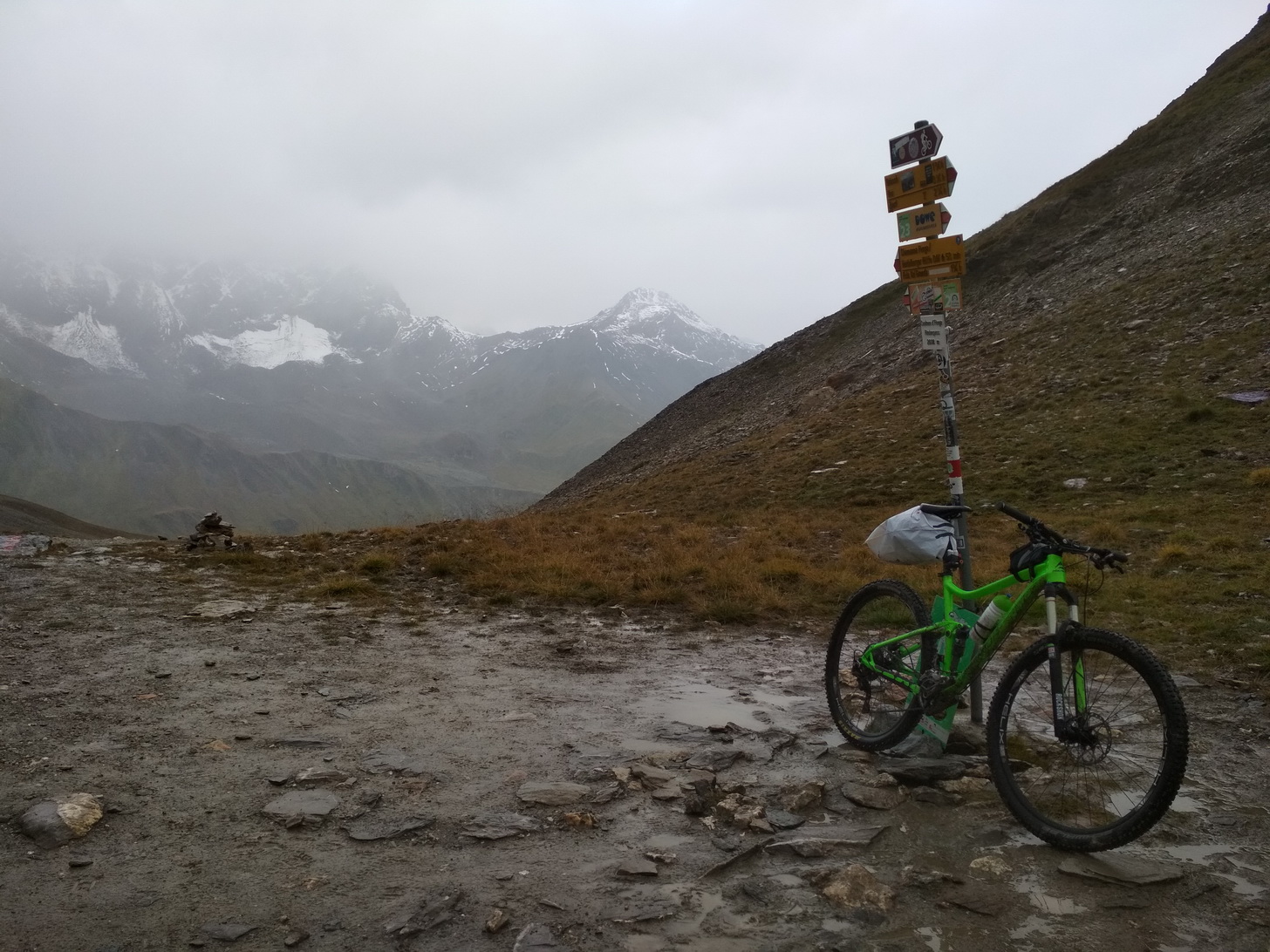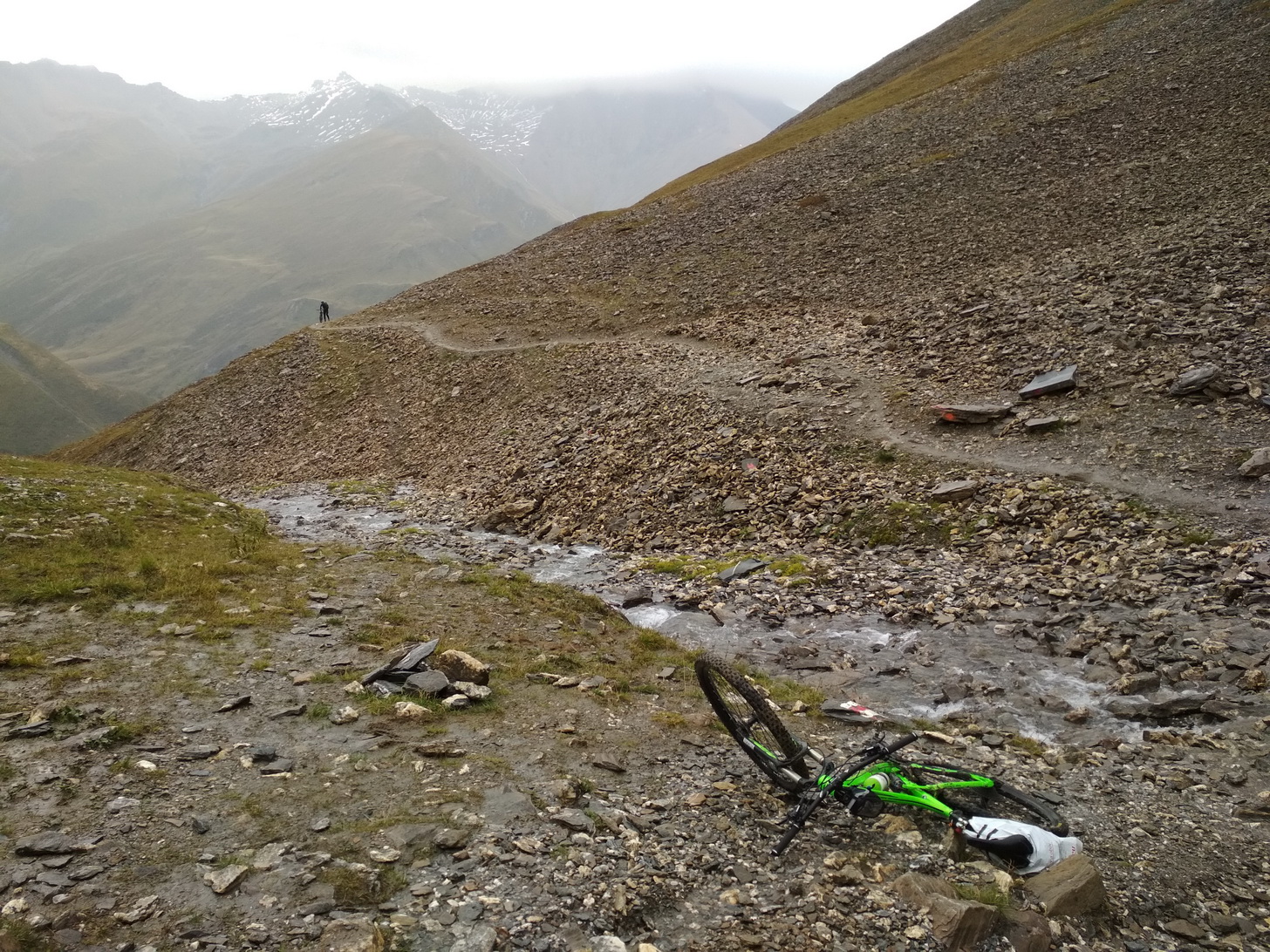To je klasické transalpové sedlo. Zo švajčiarskej strany je posledných 600 v.m. tlačenka, ale celkom príjemná. Hory sú nádherné, počasie sa opäť pokazilo, nálada je skvelá. Zjazd k Heidelbergerhutte je zábava. Všade strieka blato. Od chaty je to tiež zábava, ale už šotolina. Dalo by sa tu vymyslieť aj niečo navyše pojazdiť, no nám tu počasie nepraje. Zvažujeme aj nocľah na Heidelbergerhutte, no aby sme ráno nezačínali deň dlhým zjazdom pravdepodobne v daždi, tak radšej sme sa ubytovali opäť v príjemnom hoteli v mestečku Ischgl.