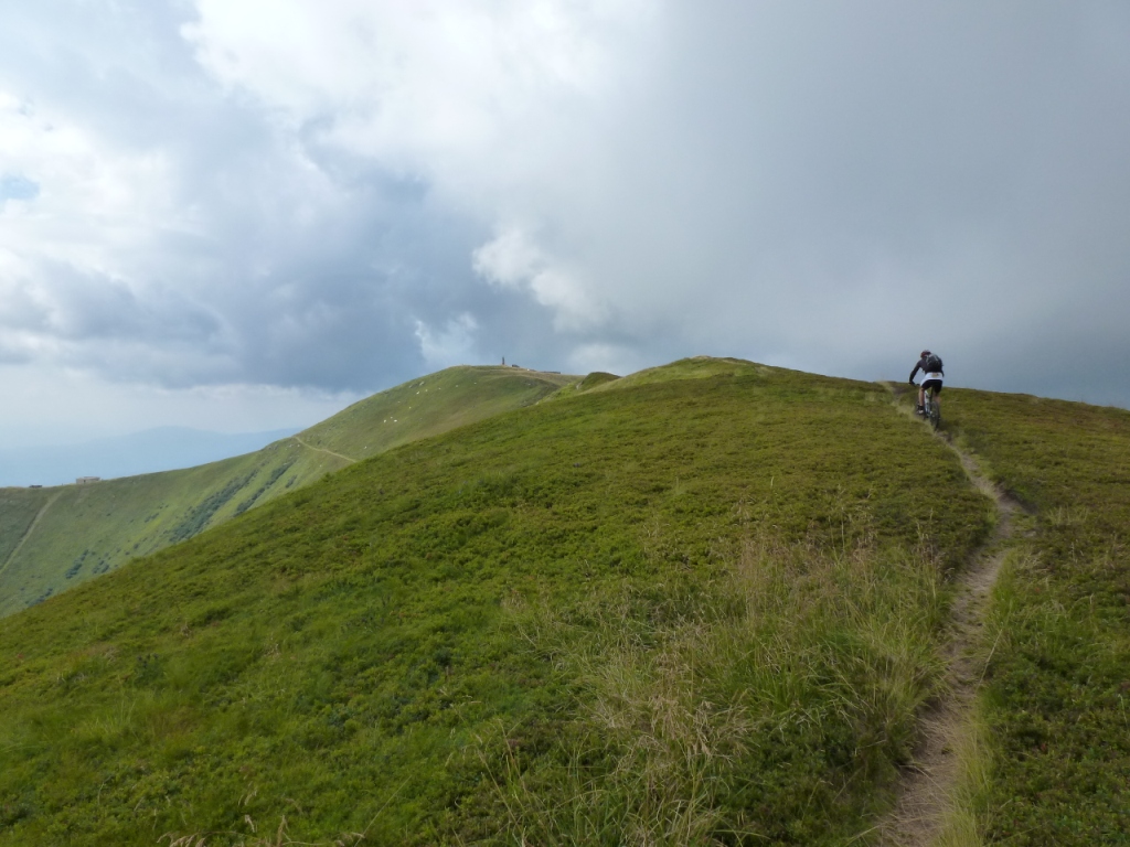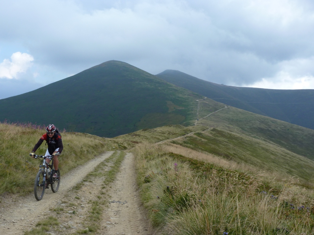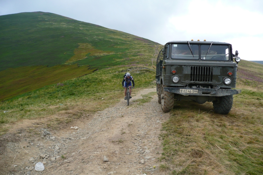 Z opačnej strany vedie na vrch cesta. Priamo na vrchole stojí Nissan Patrol s českým evidenčným číslom. Doviezol tu aj ľudí z Kyjeva. Tá pani neverí vlastným očiam, že sme tu na bicykloch. Hneď sa nadväzuje družba, nalievajú vodku, dostali sme chleba so slaninou a fotia sa s nami. Veliký Verch už zakryl čierny mrak. Vodka bola lahodná, slanina slaná, pripil si aj šofér. Pôvodný plán bol sa teraz vrátiť na Veliký Verch a pokračovať hrebeňom Boržavy na juh. Náš pôvodne plánovaný zjazd do Lysychova je však vraj nemožný, mračno sa blíži na Stoj a keď sa tak pozriem na zamýšľanú trasu, tak to vyzerá ozaj nereálne. Zo Stoja preto volíme zjazd k železničnej stanici Osa. Ak tam chcete zo Stoja trafiť, treba sa pozorne zahľadieť do mapy, zvoliť smer a intuitívne odbočiť na správnych miestach. Nie je to však až také ťažké a keď už budete pochybovať o správnosti zvoleného smeru, pretože náš hrebeň sa bude vnárať do lesa, natrafíte na žltú turistickú značku a na tomto chodníčku bude vaše bajkerské srdce krochkať blahom, kotúče budú smrdieť a celé telo zaleje eufória z nádherného, vcelku ťažkého zjazdu. Tento zjazd má z vrcholu Stoj na železničnú stanicu Osa prevýšenie okolo 1300m. Je to skrátka bomba.