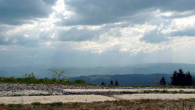 Pod vrcholom sa páslo stádo koní, čo dodávalo tomuto miestu čarovnú atmosféru. Na vrchole slaninka, pohodička a na spestrenie paraglidisti. Zakvasili sme tam viac než na hodinu a Sašo stále nedošiel. Pýtali sme sa motorkára a ten ho nestretol.