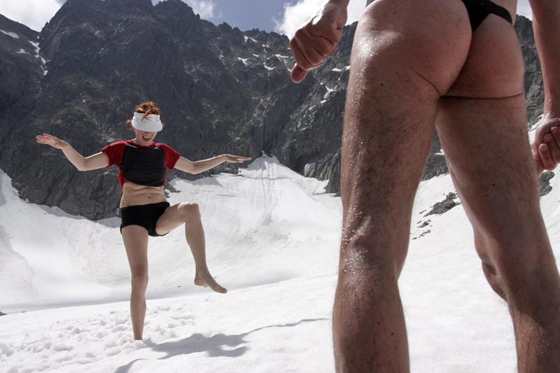 Okolo plesa stúpame hore po starých reťaziach do Veľkej Zmrzlej, veľké snehové polia stále lákajú aj na lyže. Božské ticho. V Baranej kotlinke pod kopcom chladíme rozpaléné telá a tatranské vášne v snehu, obedujeme a dohadujeme sa ako ďalej, sprava či zľava. Ideme vpravo cez trávnatú lávku na hrebeň, polovica zostupuje späť, vrcholové družstvo po 50min úspešne máva a píska z vrcholu. Až na jeden opatrný úsek to bolo celé v pohode.