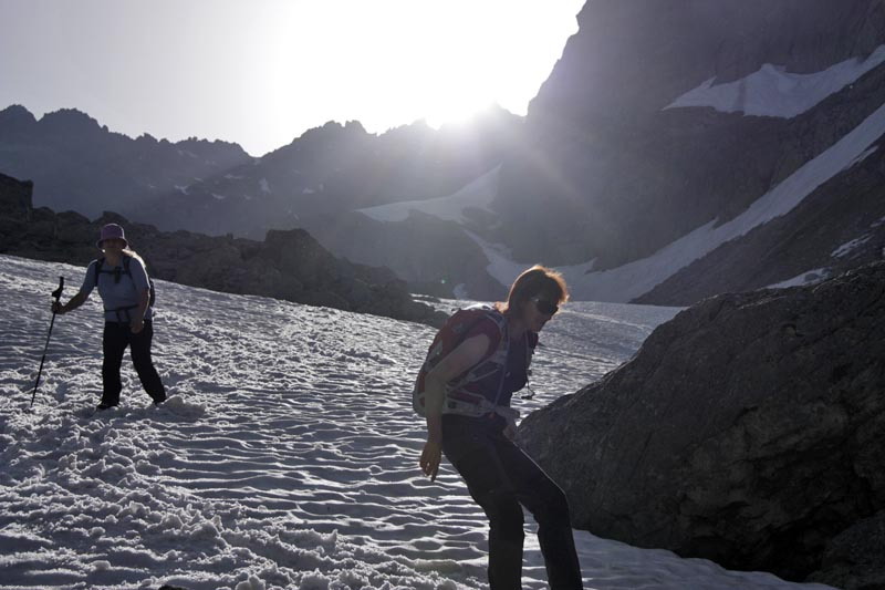 Zostup snehom ide rýchlo, teraz by sa hodili lyže! Dobrým aj zdravým zvykom sa stáva kúpanie v jazere, v zátoke bez prítoku je vraj voda teplejšia :-) Pekný deň v horách, tešíme sa na ďalšie vrcholy, možno už v základnom tábore. :-)