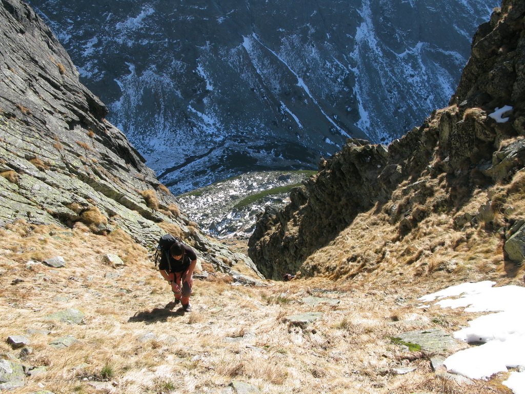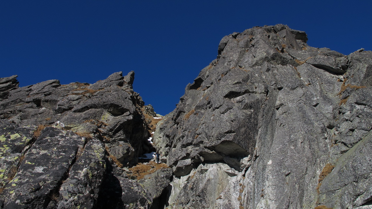 Po vylezení na Zlomiskovú vežu zliezame po tvrdom snehu do Zlomiskovej štrbiny. Hneď nám je jasné, že to bude na dlhšie... Potom sa však terén trošku umúdri a nám sa darí postupovať miestami exponovaným skalným hrebeňom.