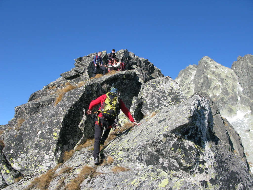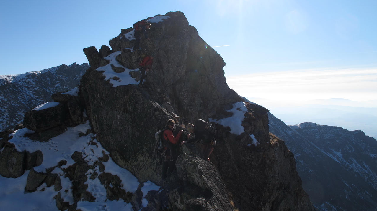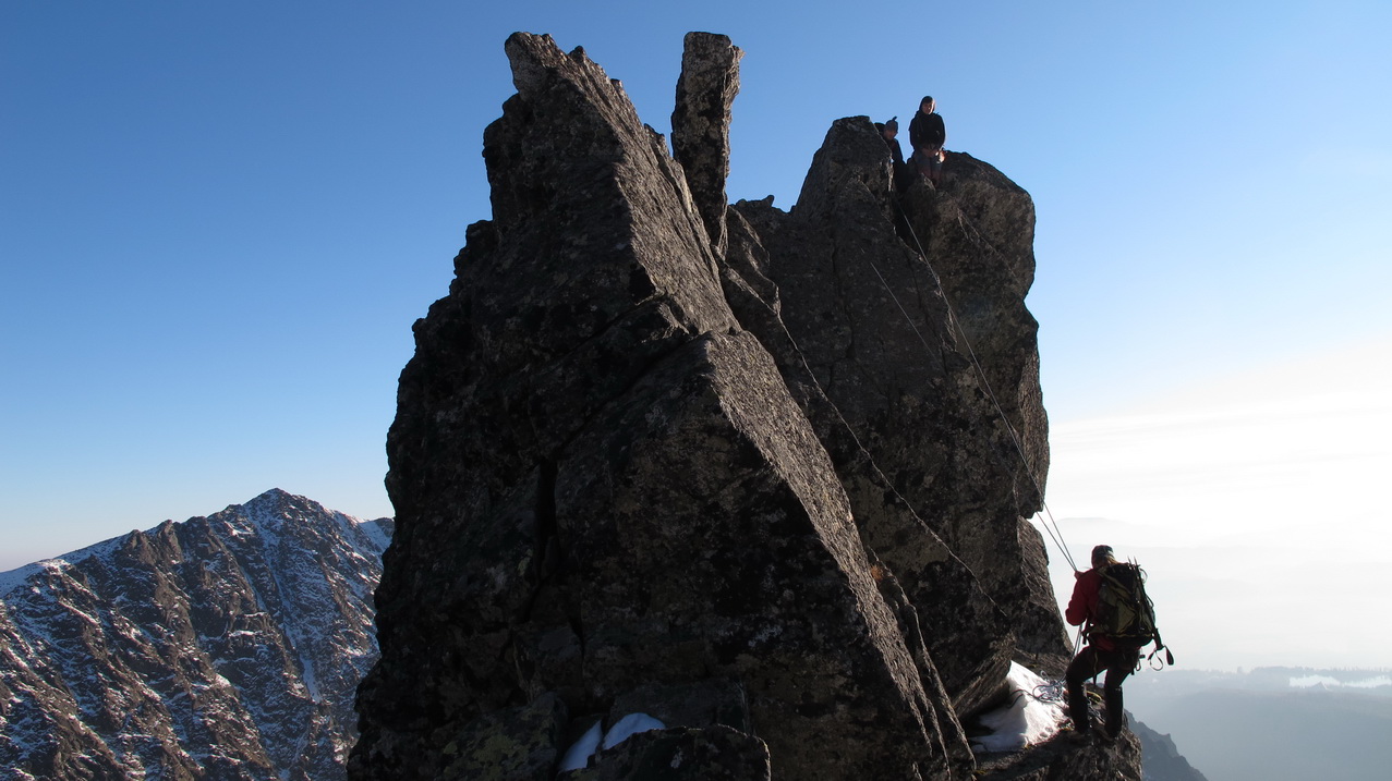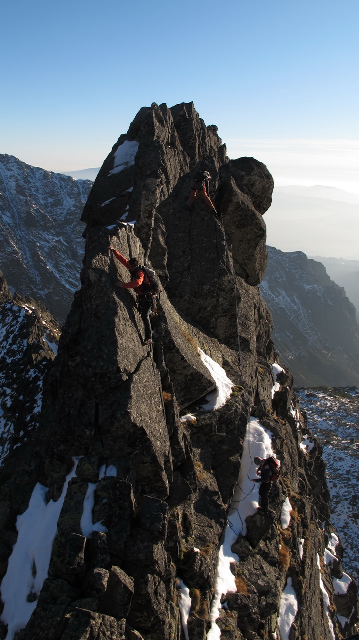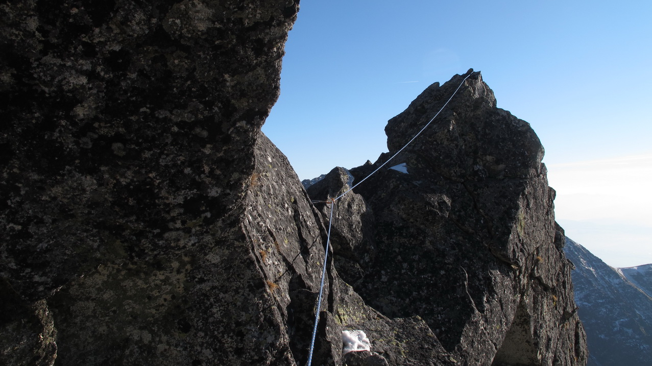 Preliezame kľúčové miesto a exponovaným hrebeňom ideme ďalej. Zlaňák za zlaňákom. Tam, kde je treba, už sú staré sľučky.