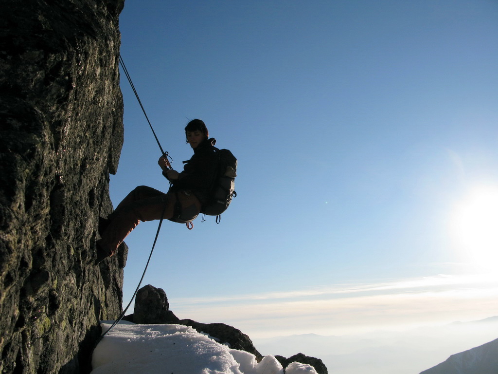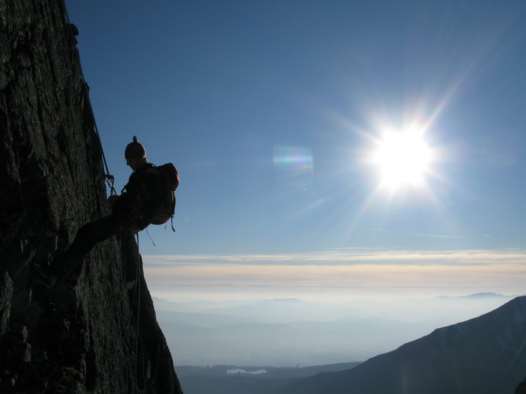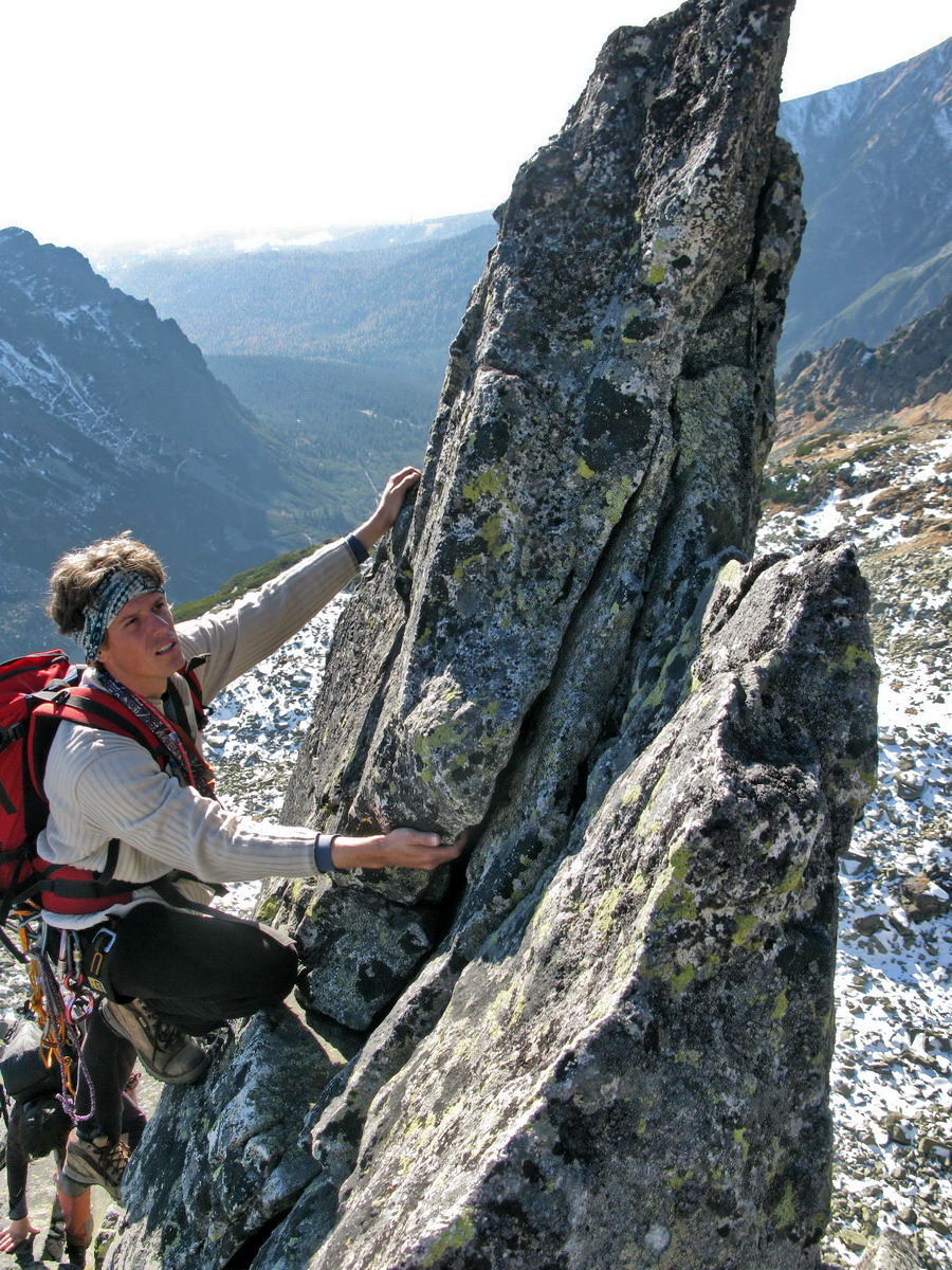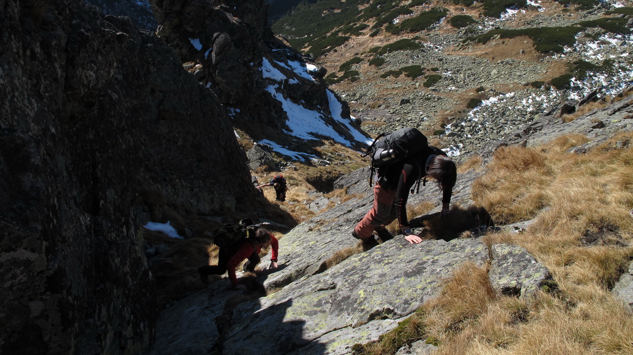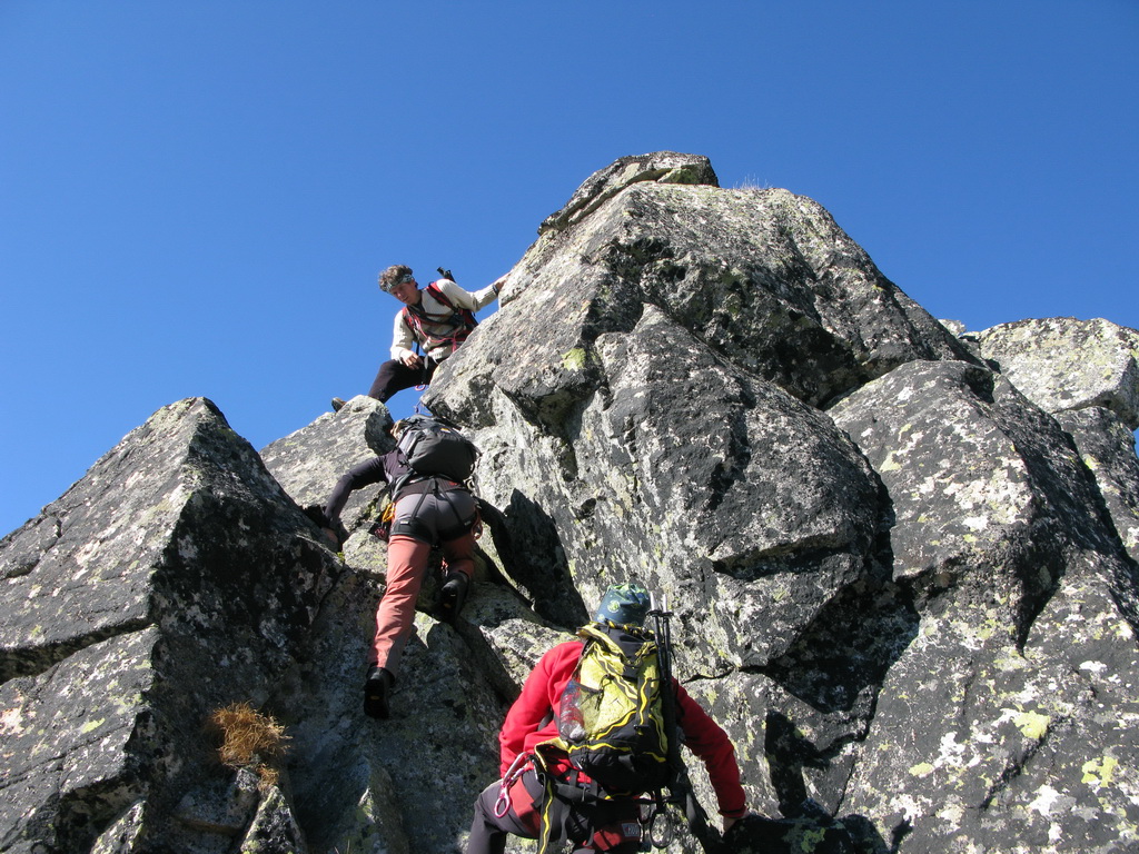 Preliezame kľúčové miesto a exponovaným hrebeňom ideme ďalej. Zlaňák za zlaňákom. Tam, kde je treba, už sú staré sľučky.