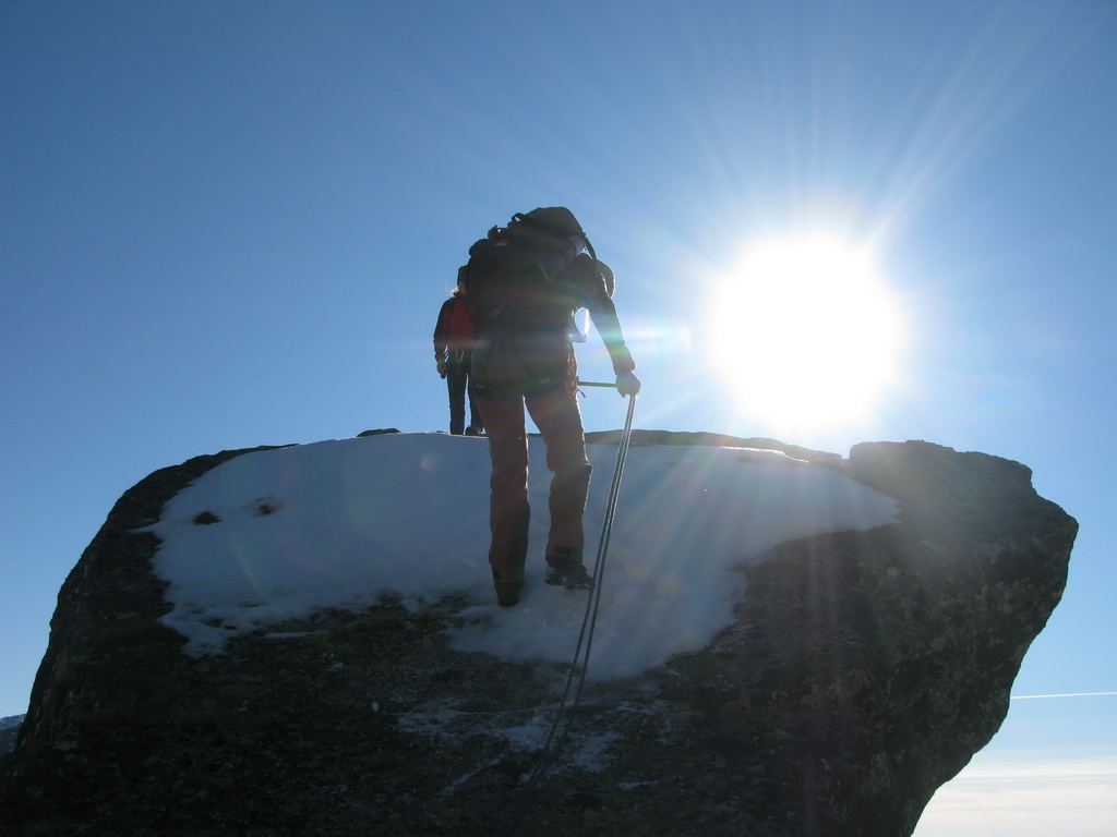 Vychutnávame si krásne úseky hrebeňa po veľkých žulových blokoch a poškuľujeme po slnku, ktoré sa chystá zapadnúť.