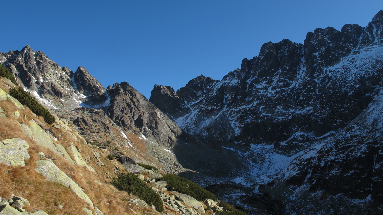 Pokročilá jeseň v Tatrách. V žľaboch a na severných úbočiach už je tvrdý sneh. Vybrať si peknú túru však nie je problém ani v tomto období.
