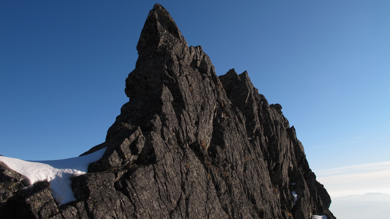 My dnes pôjdeme opačným smerom. Začíname prudkým výšľapom po suti a trávach cez strmý žľab na Zlomiskovú vežu. V tomto smere išli hrebeňom ako prví bratia Komarnickí v roku 1911. Sprievodca udáva obtiažnosť 3. Túru nám však spríjemní tvrdý zľadovatelý sneh na severovýchodnej strane hrebeňa.