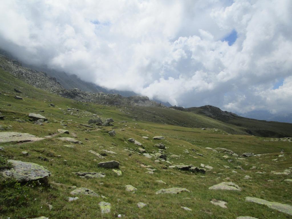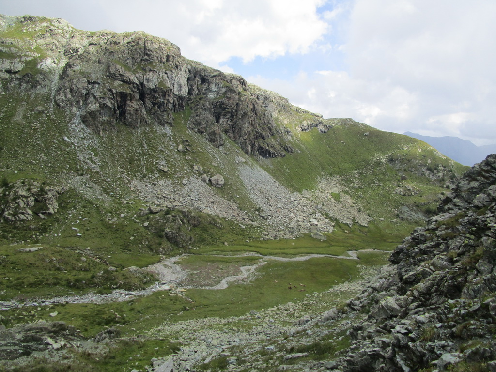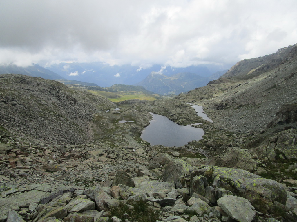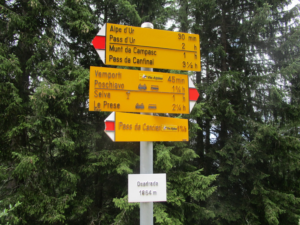 Netuším, čo ma čaká na druhú stranu, začínam zjazdovať ale po chvíli musím zosadať a zniesť bajk chodníkom kde sú úseky s reťazami. Dole kopcom sa však bajk prepraví ľahko a tak zakrátko už zjazdujem po lúkach a pasienkoch Campagneda. Prechádzam okolo chaty Rumsatsch a po spevnenej ceste sa blížim ku miestu s názvom Campo Moro. Až tu sa rozhodujem kde sa vlastne zvrtnem a začnem vraciať naspäť. Nakoniec rozhodnutie padne na návrat dolinou Val Poschiavina.