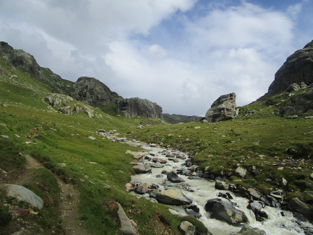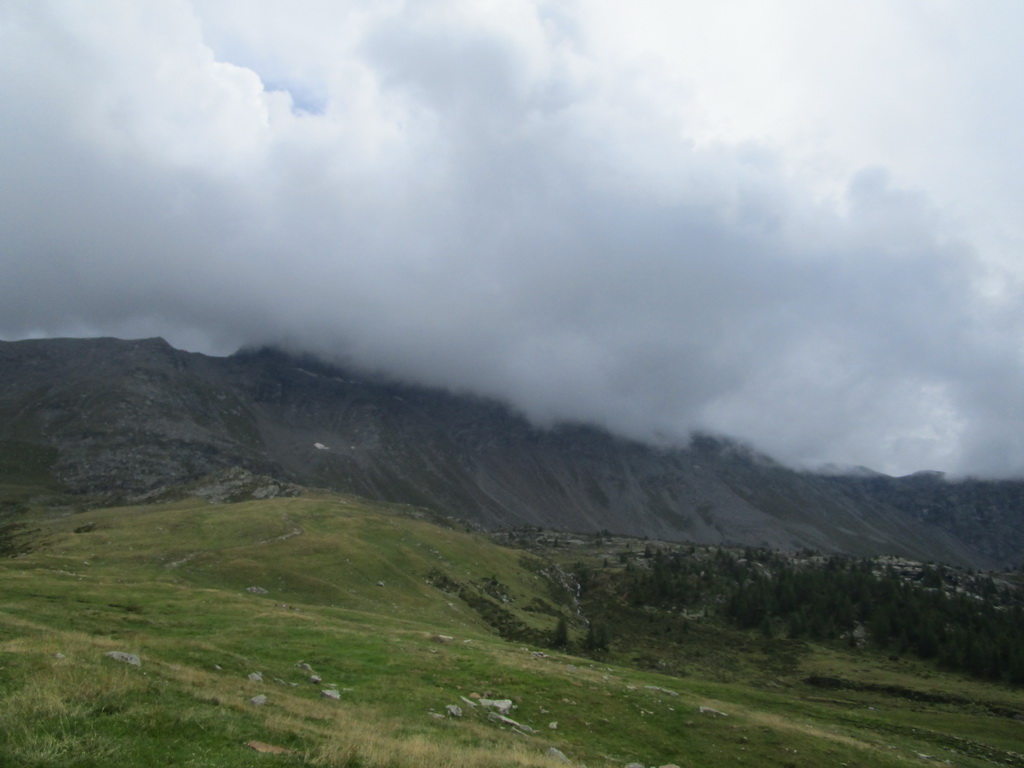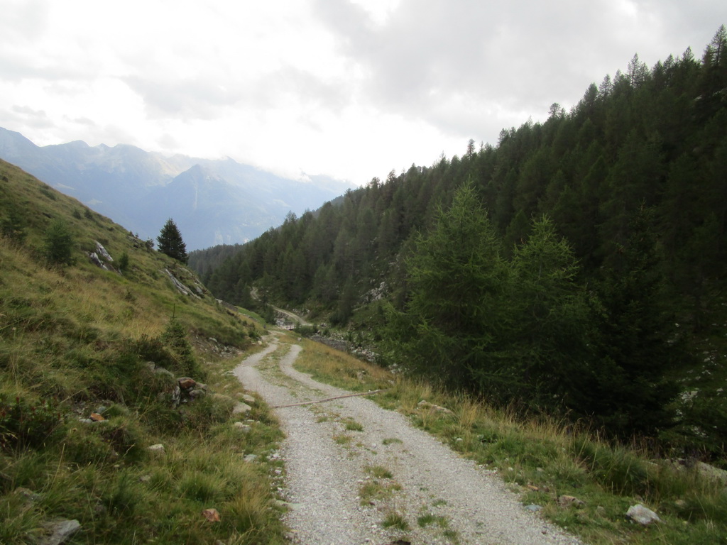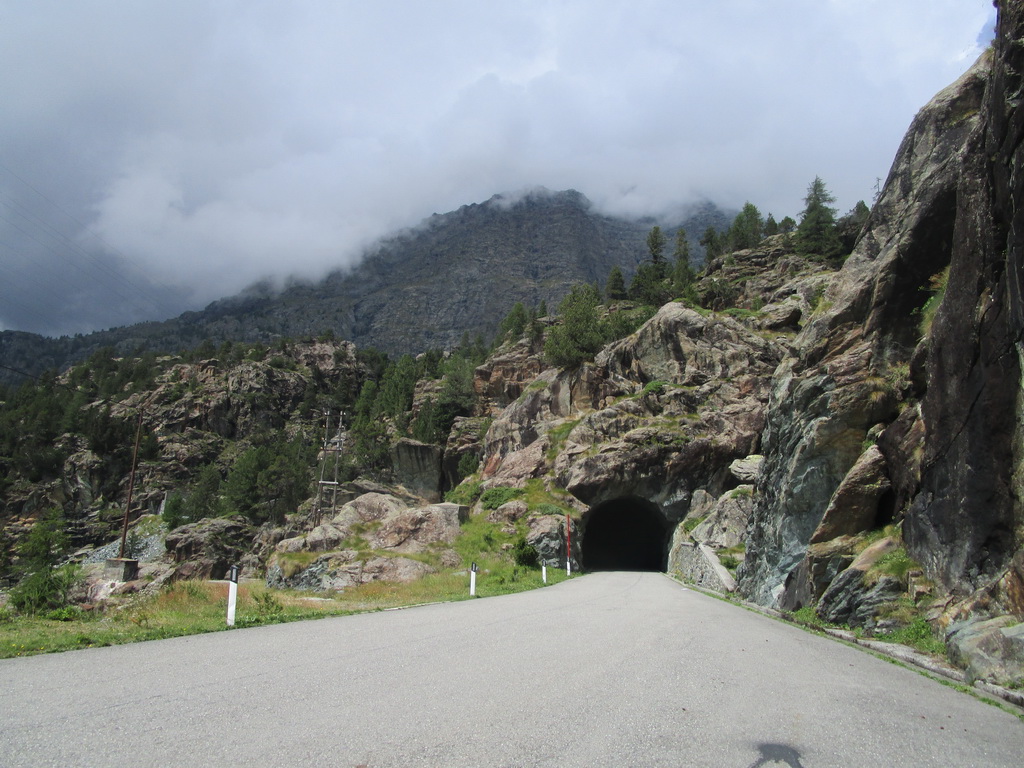 Ku priehrade pohodlne vyšliapem na bajku po asfaltke. Od priehrady do ústia doliny Poschiavina to ide tiež v sedle. Otvárajú sa mi nádherné výhľady do ústia tejto doliny. Naháňa ma síce dážď ale nemôžem prestať fotiť. Začiatok doliny je zjazdný ale čoskoro začínajú úseky s veľkými kameňmi a treba tlačiť. Záver doliny Poschivina v stúpaní do sedla Ciancian je strmý technický úsek. Oceňujem že som si zobral karbónový bajk a ľahko sa mi nesie na chrbte.