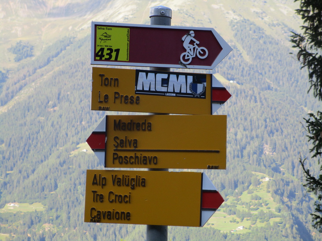 V sedle uzatváram okruh, zjazdujem už známym chodníčkom. Na začiatku ma čakajú aj chodecké úseky neskôr to už po spevnenej ceste je riadny fukot. Odvažujem sa ešte na zachádzku značenou cyklotrasou nad poschiavom s názvom Thron. Zjazdujem potom okolo rovnomennej usadlosti až dole ku jazeru. Odtiaľ ma ešte čaká stúpanie z Poschiava do Sfazú - 610v.m. po asfalte.