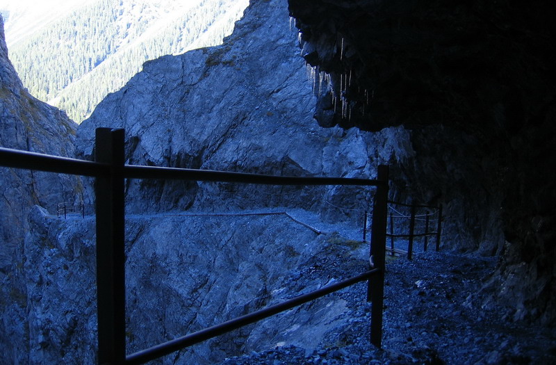 Tabuľa na začiatku upozorňuje cyklistov, aby neriskovali a svoje stroje radšej tlačili. Nechávam bicykel na začiatku a peši v tretrách idem ďalej. Cestička je vytesaná v skalnej stene, miestami až sto metrov nad dnom rokliny.