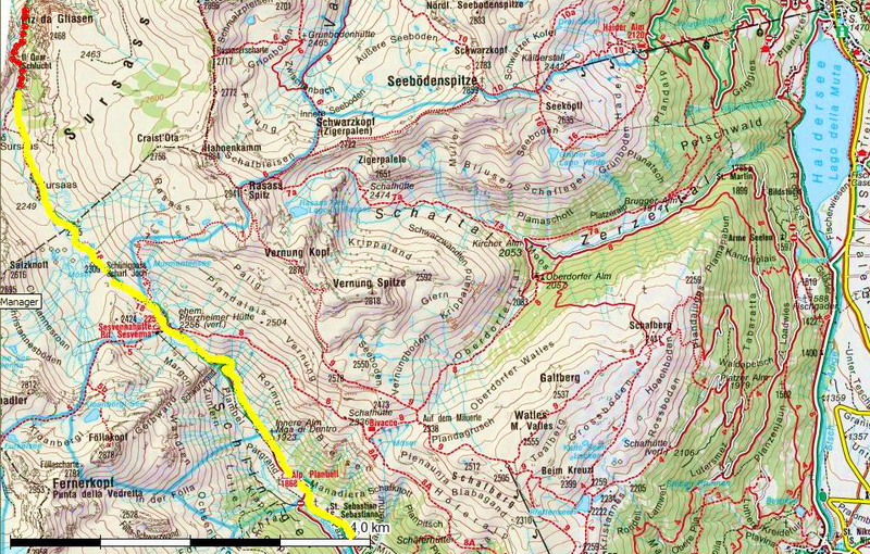 Pôvodný plán ísť na biku cez Madritschjoch je kvôli snehu nemožný, aj všetky ďalšie nápady sú moc vysoko. Pozerám do mapy a vraciam sa k možnosti, ktorú som už včera zamietol - Val Uina. Chodníček vysekaný do skaly, spájajúci dve doliny medzi Talianskom a Švajčiarskom.