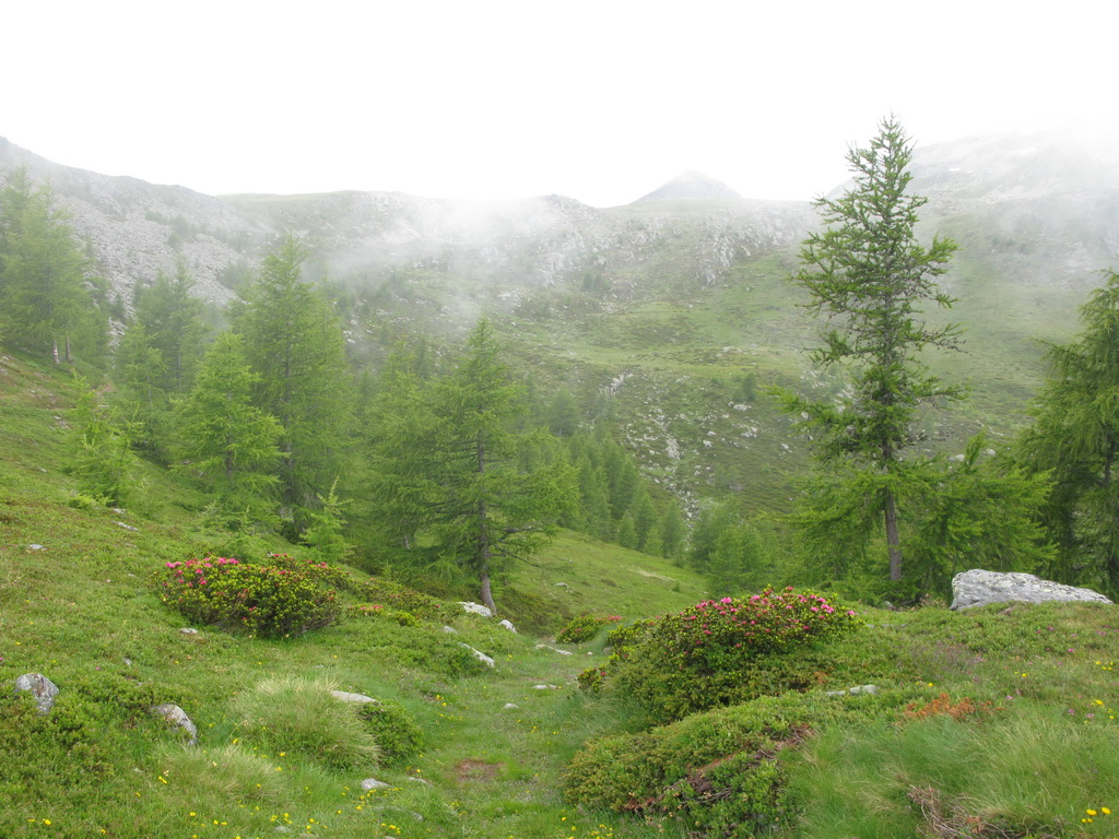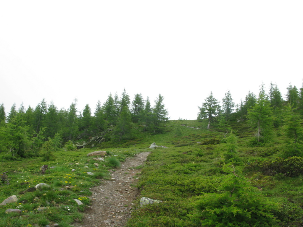Stúpanie je na začiatku asfaltové, premávka žiadna, výhľady parádne. Postupne cesta prejde do kvalitnej šotoliny, až v závere sa zmení na singltrail. Úzky chodníček na ktorom treba trošku aj potlačiť, ale to už som skoro hore. Začína pršať, nič neobvyklé. Robím si trošku starosti o kvalitu fotiek :))