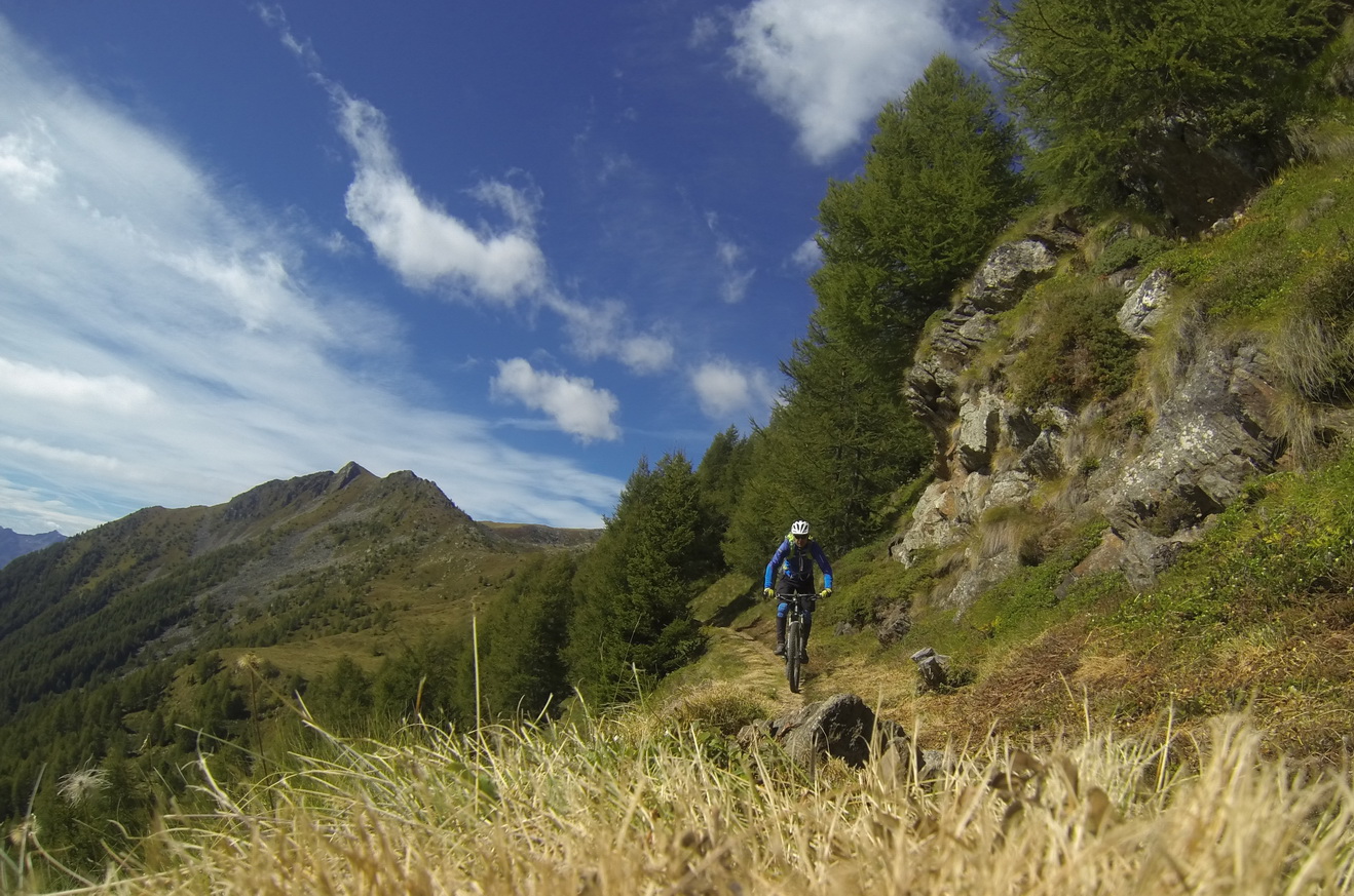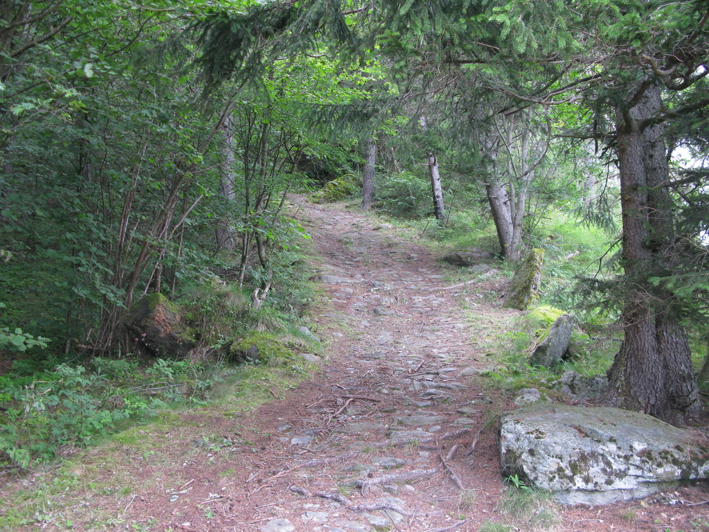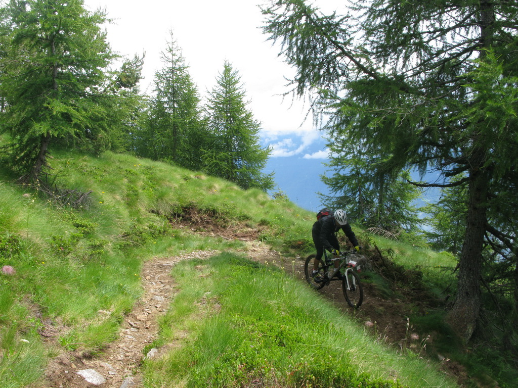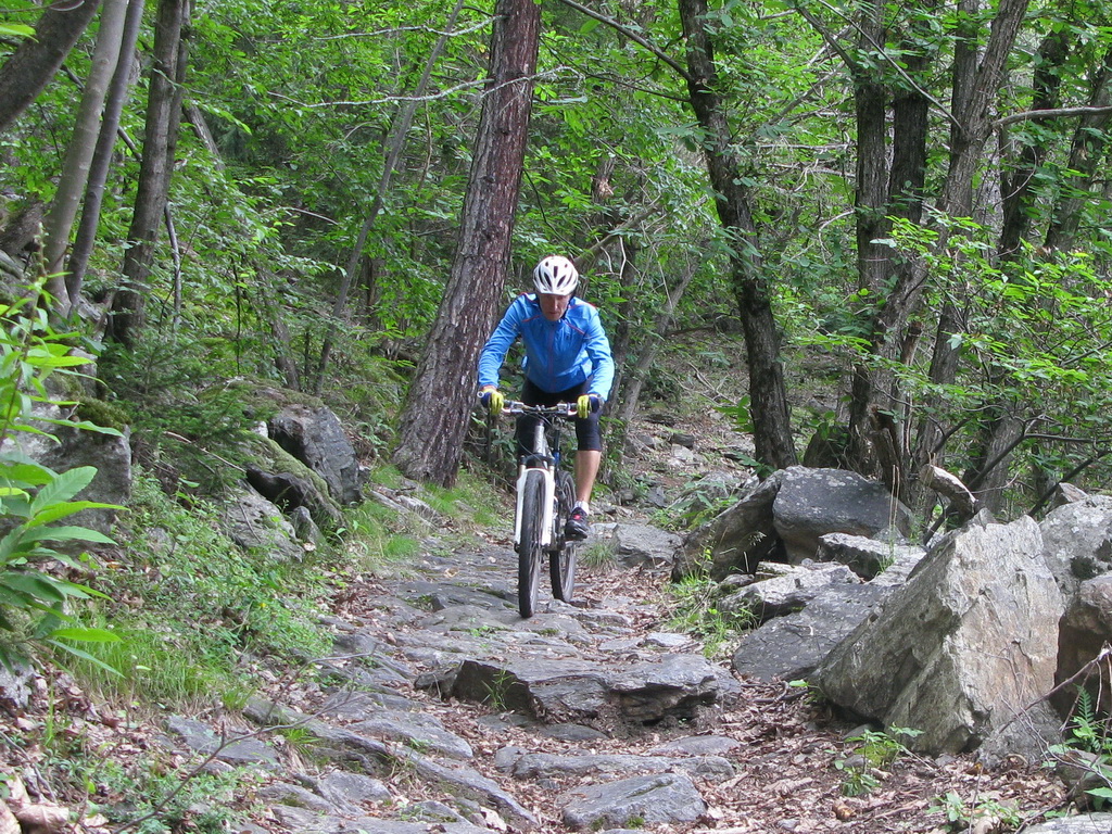 Nádherný zjazd. Strmé serpentíny. Z bajku som nezosadol, nebolo to až také ťažké. Nasleduje tretia časť vedúca starou mulatierou - chodníčkom pre muly, ktoré zásobovali vojenské pevnosti na kopci. Muly vystriedali bajkeri. Chodníček je vydlaždený veľkými kameňmi. Sú hladké a miestami aj mokré... zjazd veľmi náročný, miestami veľmi delikátne dobrzďovanie.