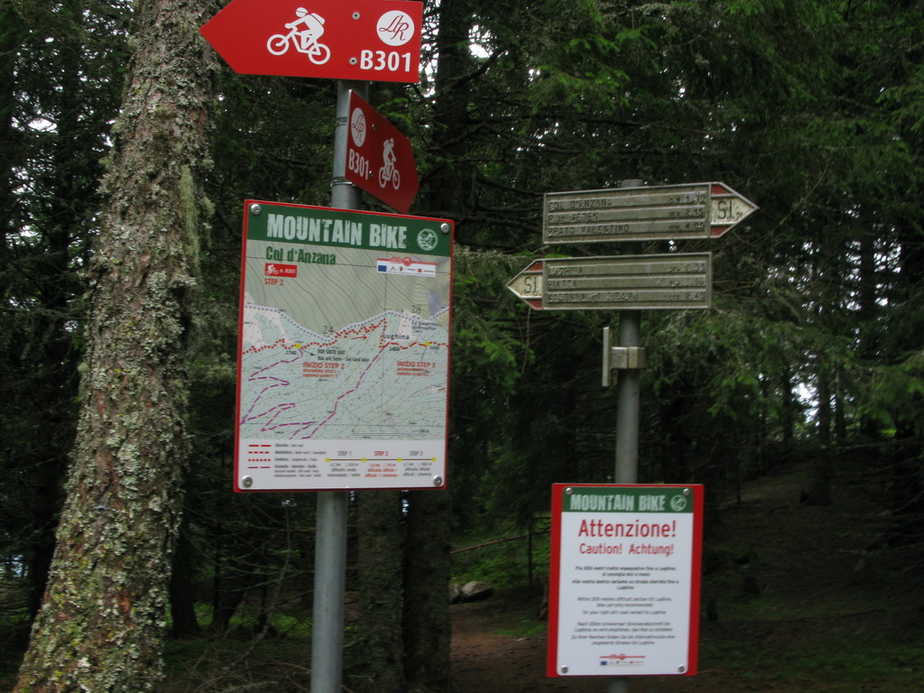Vyberám bajk z auta. Štartujem priamo od rázcestníka s turistickými značkami a jednou bajkerskou tabuľkou. Čaká ma stúpanie smer Col dAnzana, sedlo vysoké 2224m. čiže musím vystúpať 1620 výškových metrov.