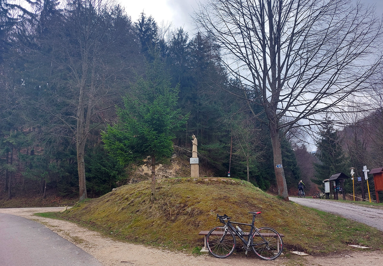 Na križovatke pod Priedhorím podobné lákadlo ako skôr (pod Mojtínom): aj tu vyzerá cesta ďalej dolinou použiteľná, tak som neodolal. Asfalt už je tu síce taký postarší, miestami poriadne vymrvený, ale veď čo? Cestou dole viac pribrzdím. V doline, na ceste aj na svahoch, už je viac stôp po ťažbe dreva, ale stále komfort, aj je čo obzerať. A od rázcestia Pod Hrádkom sa podklad aj tu radikálne vylepšuje, tak som potiahol komfortne pod sedlo Samostrel a otočil to pri kaplnke pod lúkami. Dá sa potiahnuť ešte trošku vyššie na lúku, ale tam už sú len zvyšky asfaltu. Cestou dole znovu viac priestoru na obzeranie skalných stien, a ani som nemusel tak moc brzdiť, ako som si myslel, že budem musieť :-)